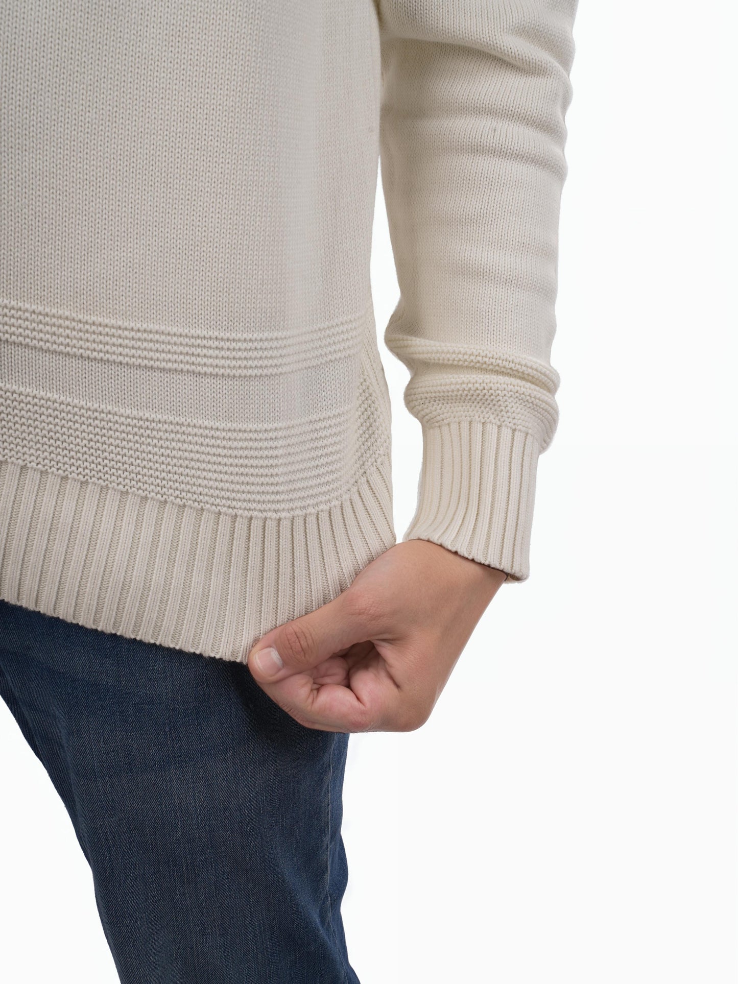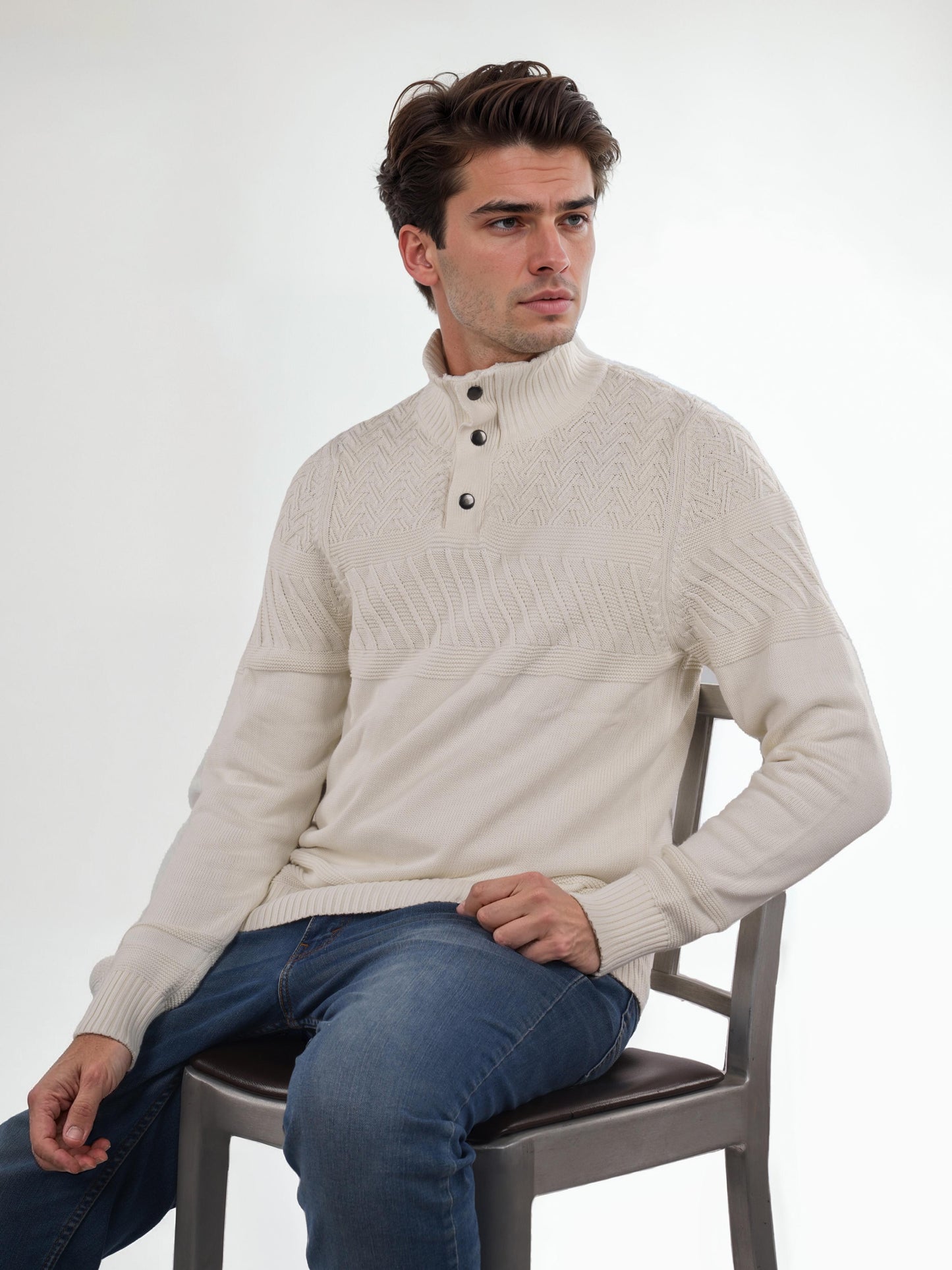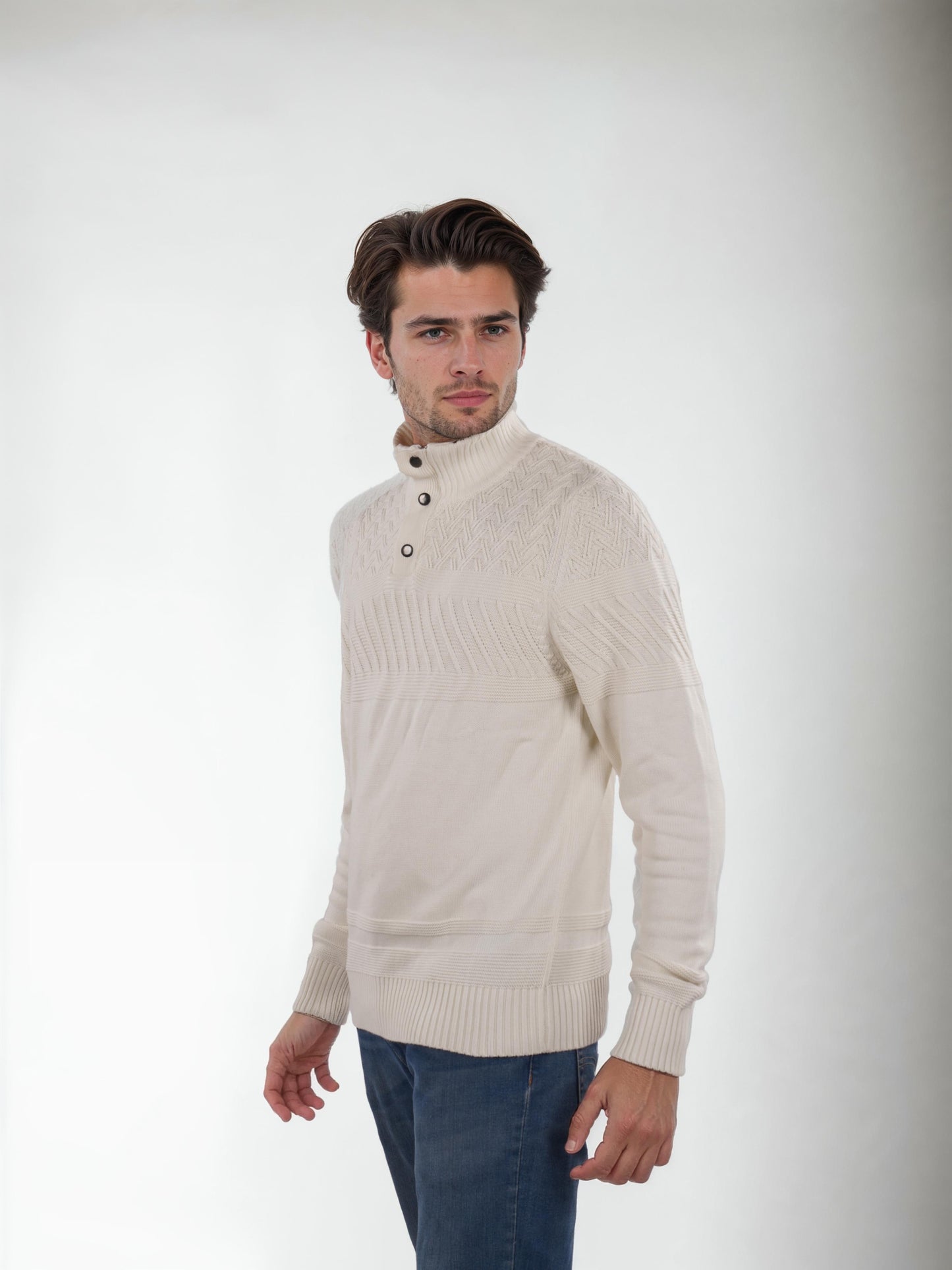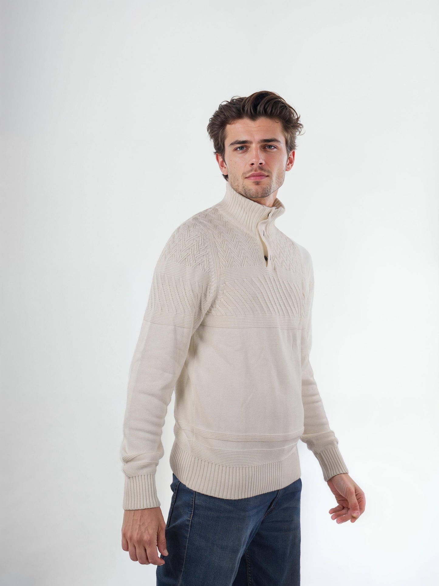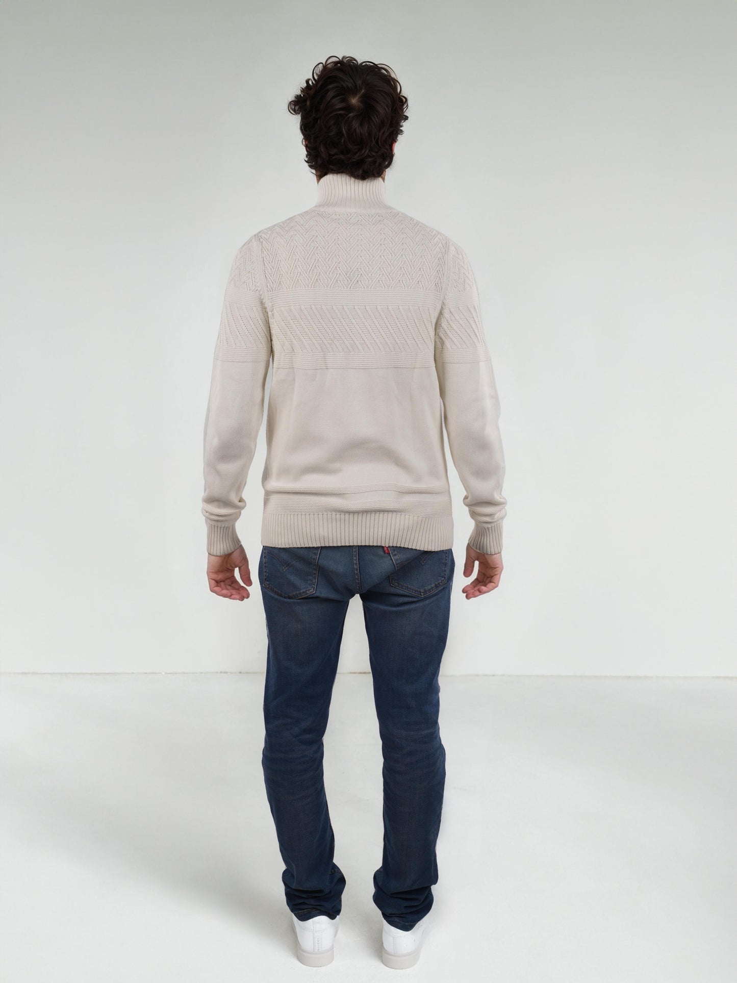 Men's off white mock collar sweater by Celio. Crafted from soft cotton, it offers a regular fit with long sleeves, perfect for casual occasions. Disclaimer: All other items in the image are only for display purposes and will not be a part of the delivery content. Product colour may slightly vary due to photographic lighting sources. Country of Origin - India.