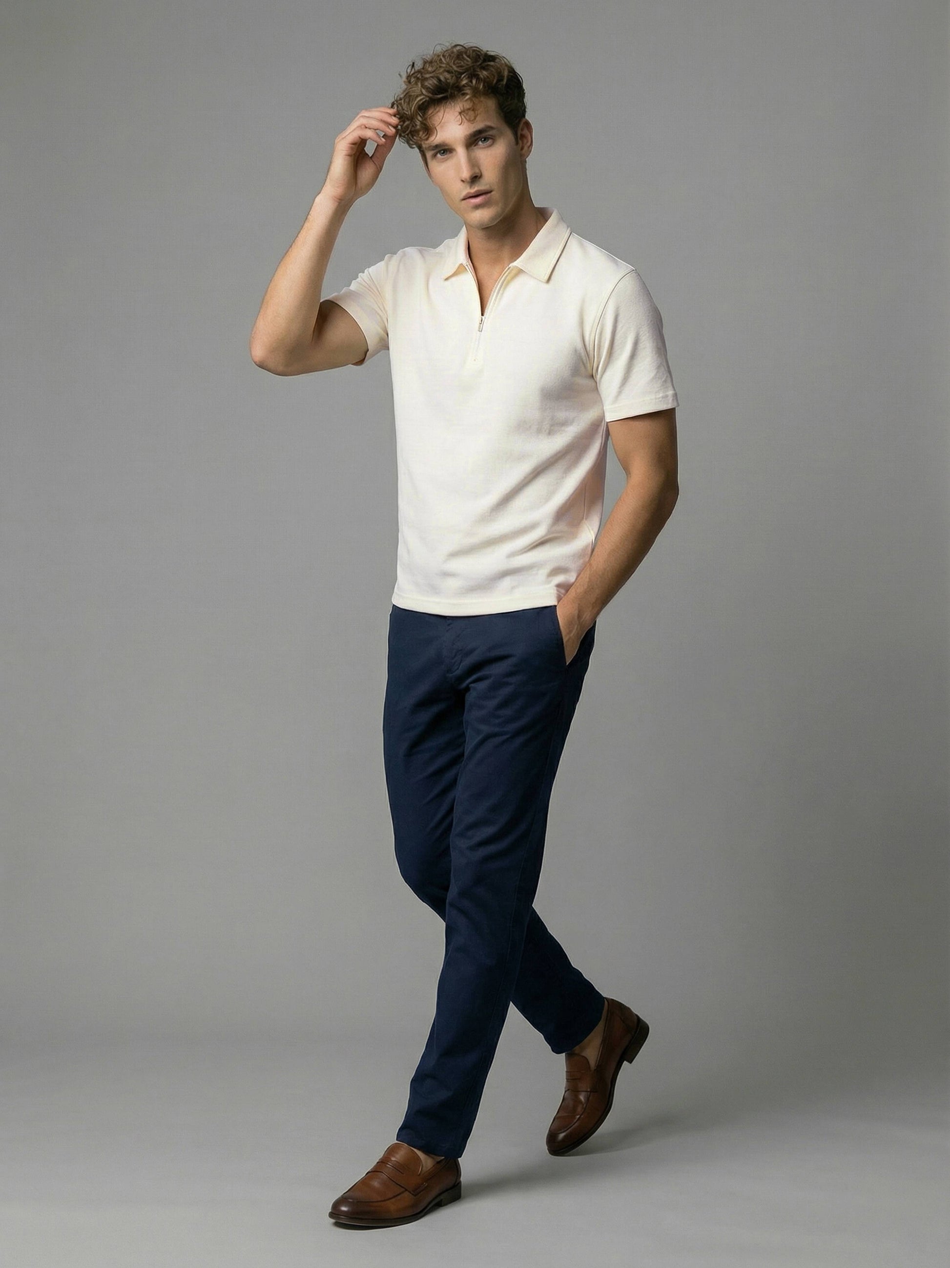 Discover the Celio Men Off White Solid Polo T-Shirt, crafted from soft cotton for a casual look. Designed with short sleeves, it's perfect for relaxed outings. Disclaimer: All other items in the image are only for display purposes and will not be a part of the delivery content. Product colour may slightly vary due to photographic lighting sources. Country of Origin - India.