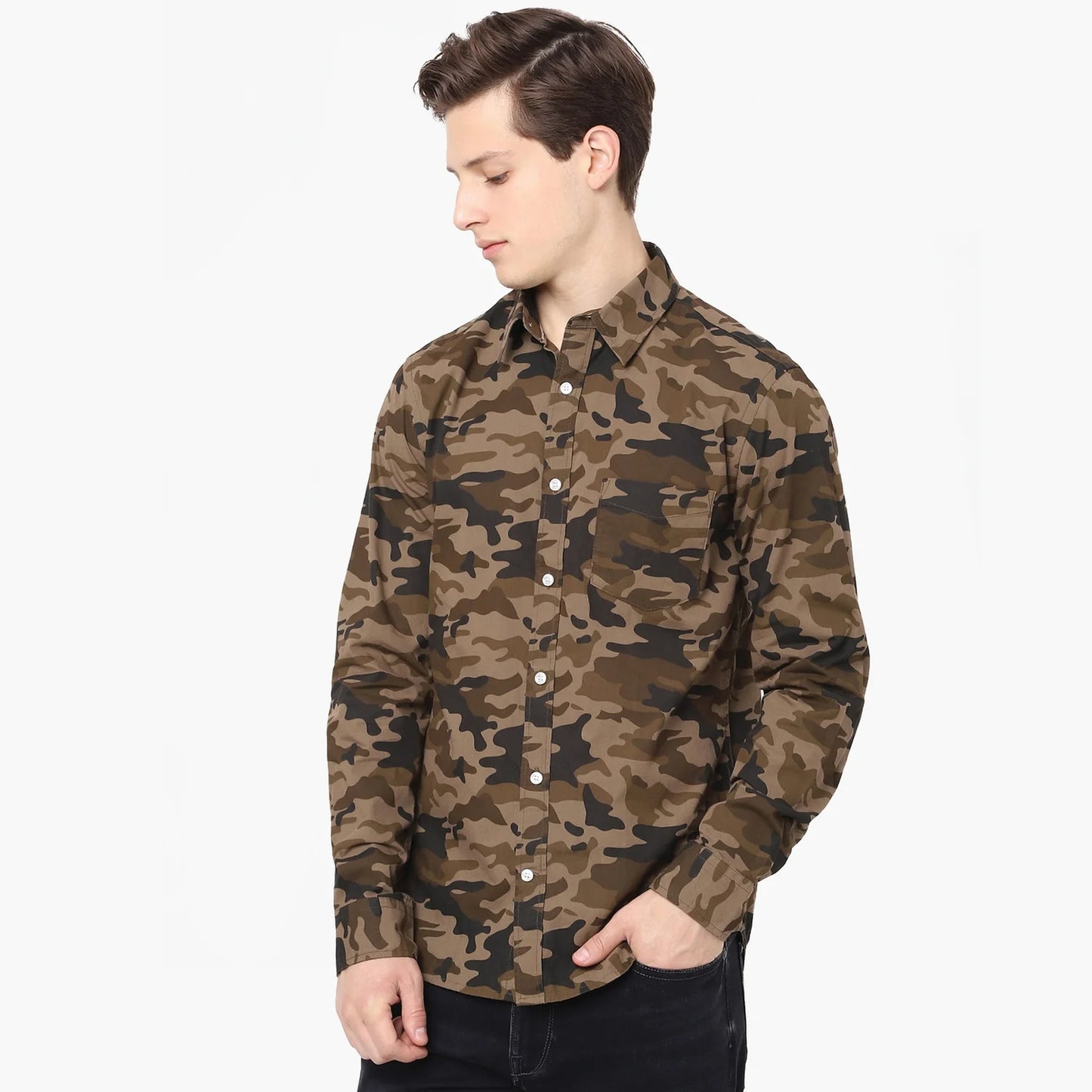 Elevate your casual style with the Celio Olive Camouflage Printed Shirt. Crafted from comfortable cotton, it features long sleeves, perfect for men who value both fashion and comfort. Disclaimer: All other items in the image are only for display purposes and will not be a part of the delivery content. Product colour may slightly vary due to photographic lighting sources. Country of Origin - India.