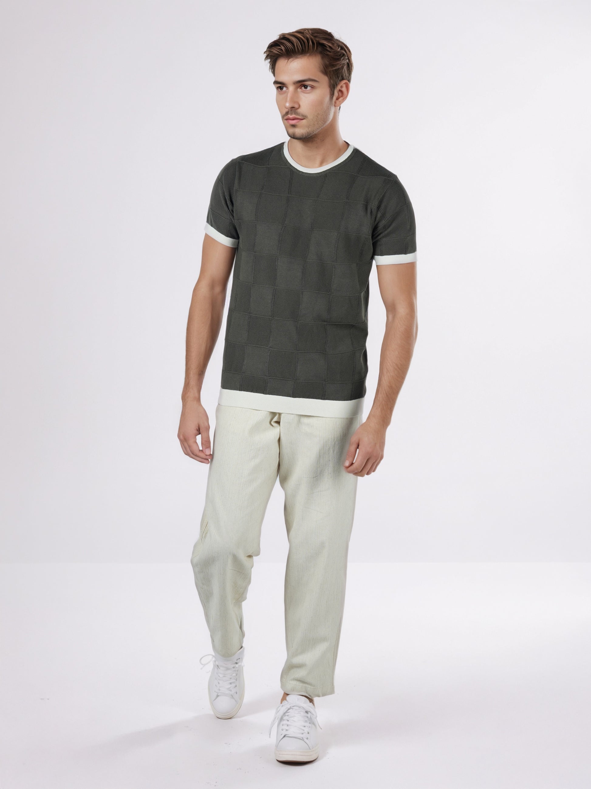 Elevate your casual wardrobe with the Celio Men Olive Checked Regular Fit T-shirt. Made from soft cotton, it features short sleeves and a stylish checked pattern. Disclaimer: All other items in the image are only for display purposes and will not be a part of the delivery content. Product colour may slightly vary due to photographic lighting sources. Country of Origin - India.