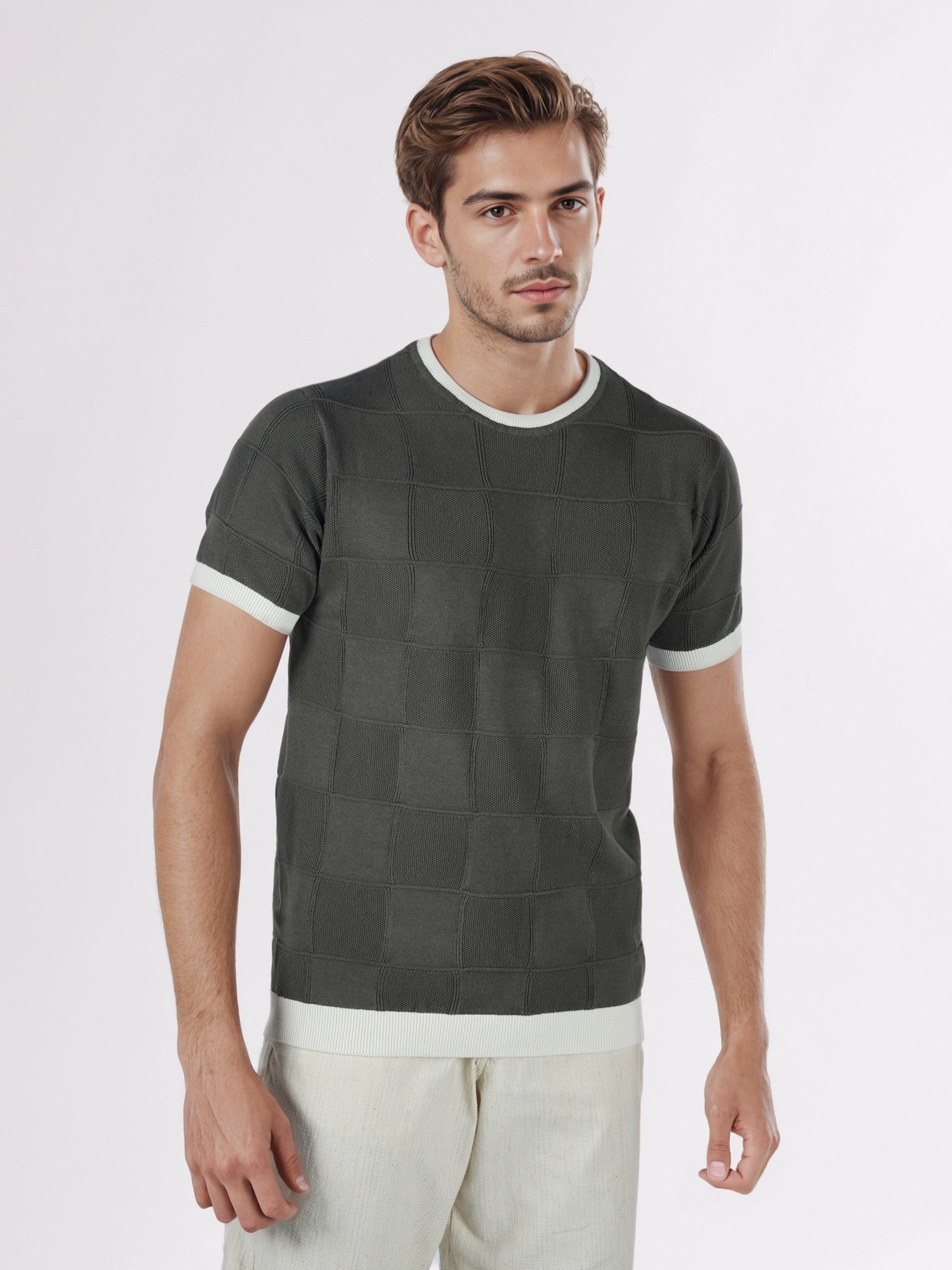 Celio* Men Olive Checked Regular Fit Cotton T-Shirts