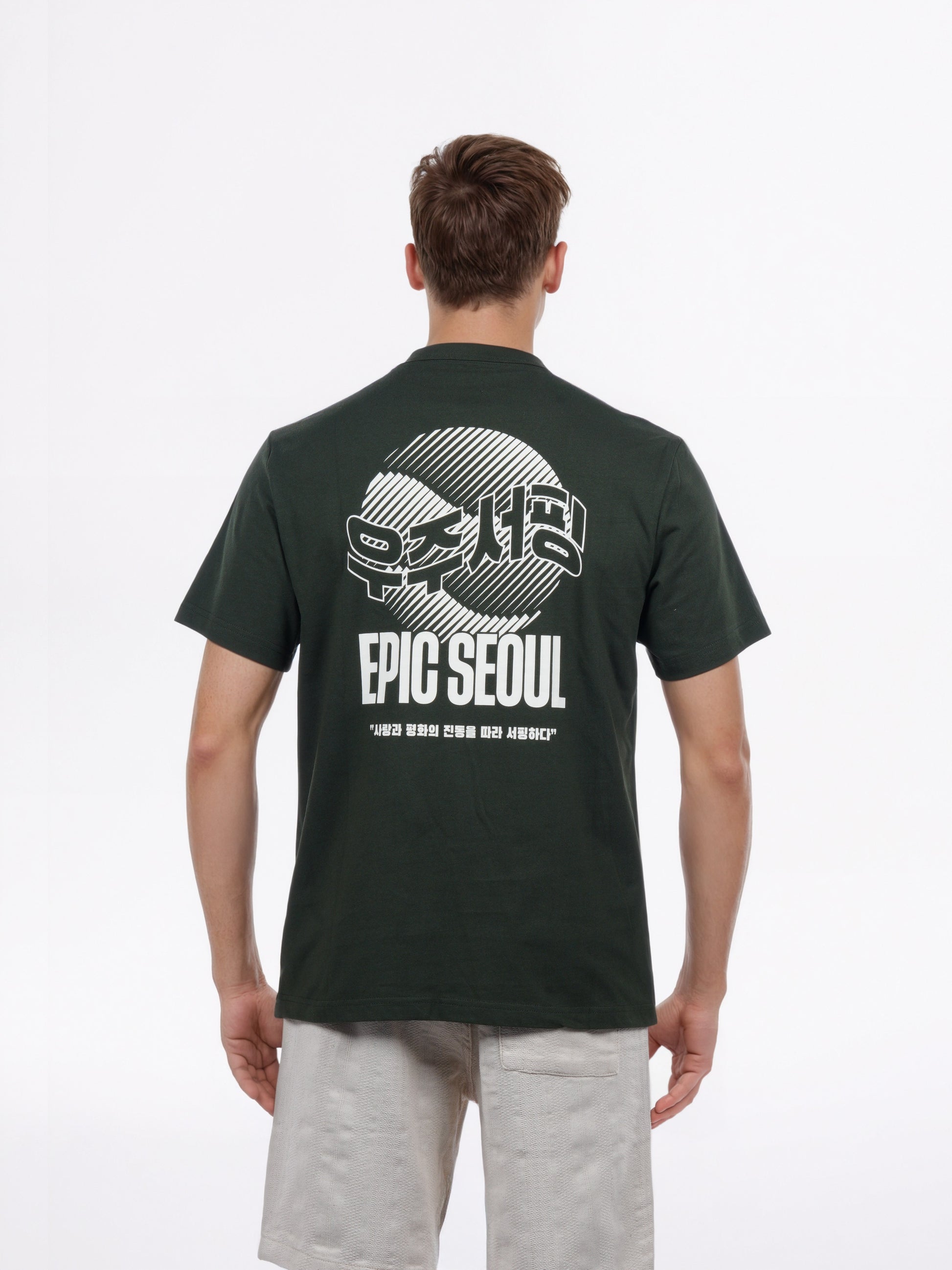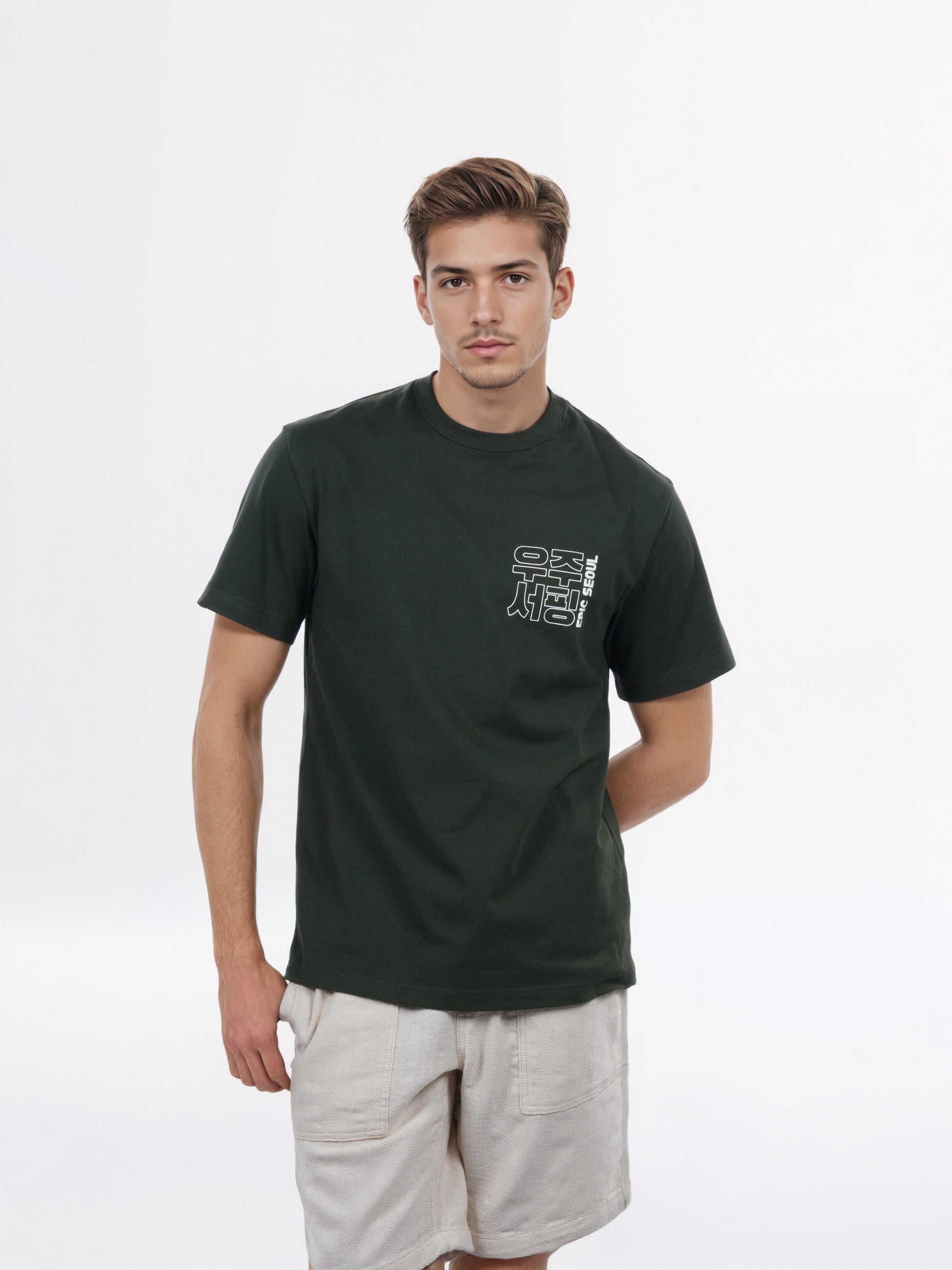 Stylish men's olive graphic tee by Celio, crafted from soft cotton. Perfect for casual outings, featuring short sleeves and a trendy boxy fit. Disclaimer: All other items in the image are only for display purposes and will not be a part of the delivery content. Product colour may slightly vary due to photographic lighting sources. Country of Origin - India.
