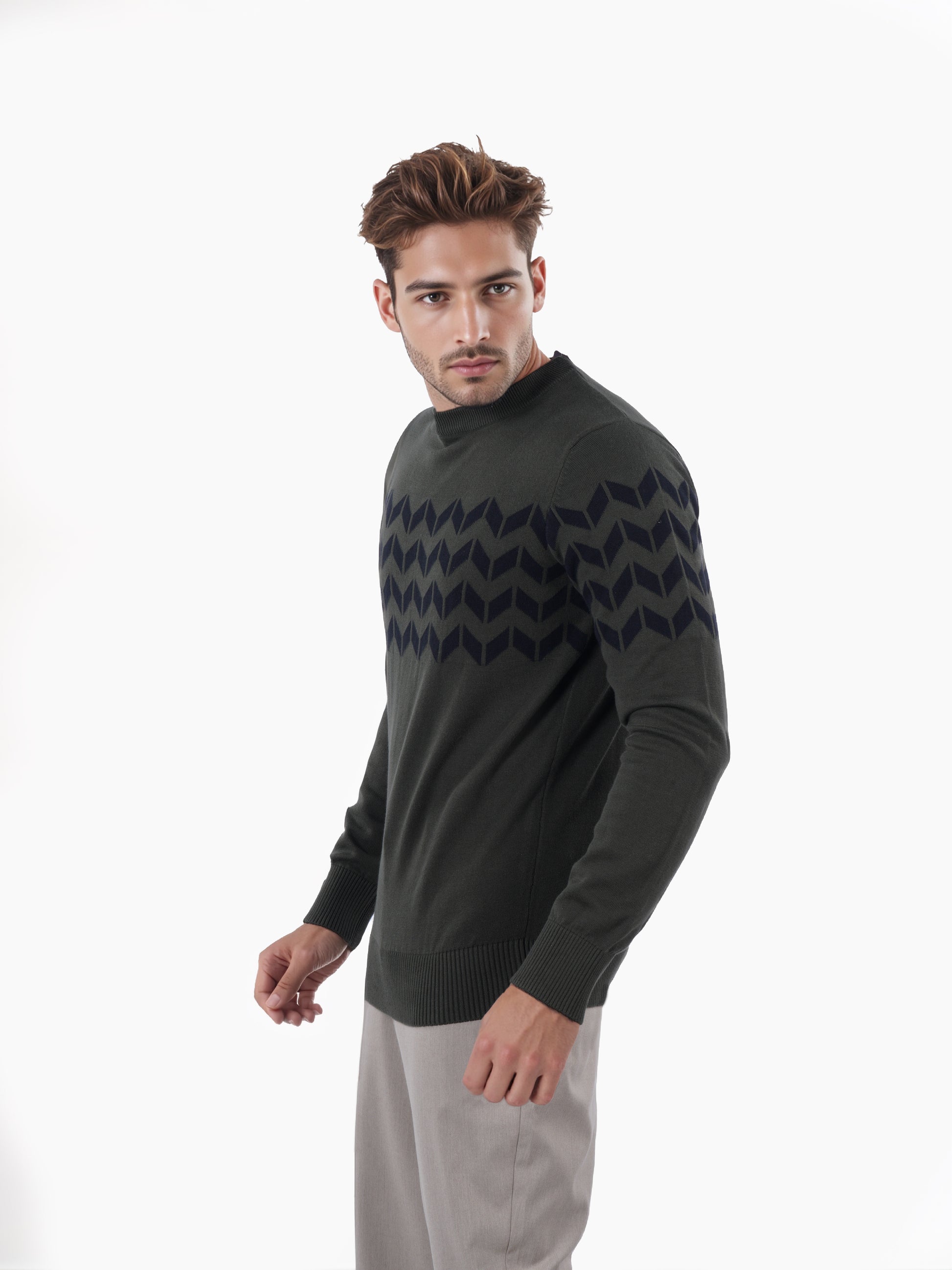 This Celio regular fit sweater in olive features long sleeves and a stylish jacquard print. Made from soft cotton, it's perfect for casual occasions. Disclaimer: All other items in the image are only for display purposes and will not be a part of the delivery content. Product colour may slightly vary due to photographic lighting sources. Country of Origin - India.