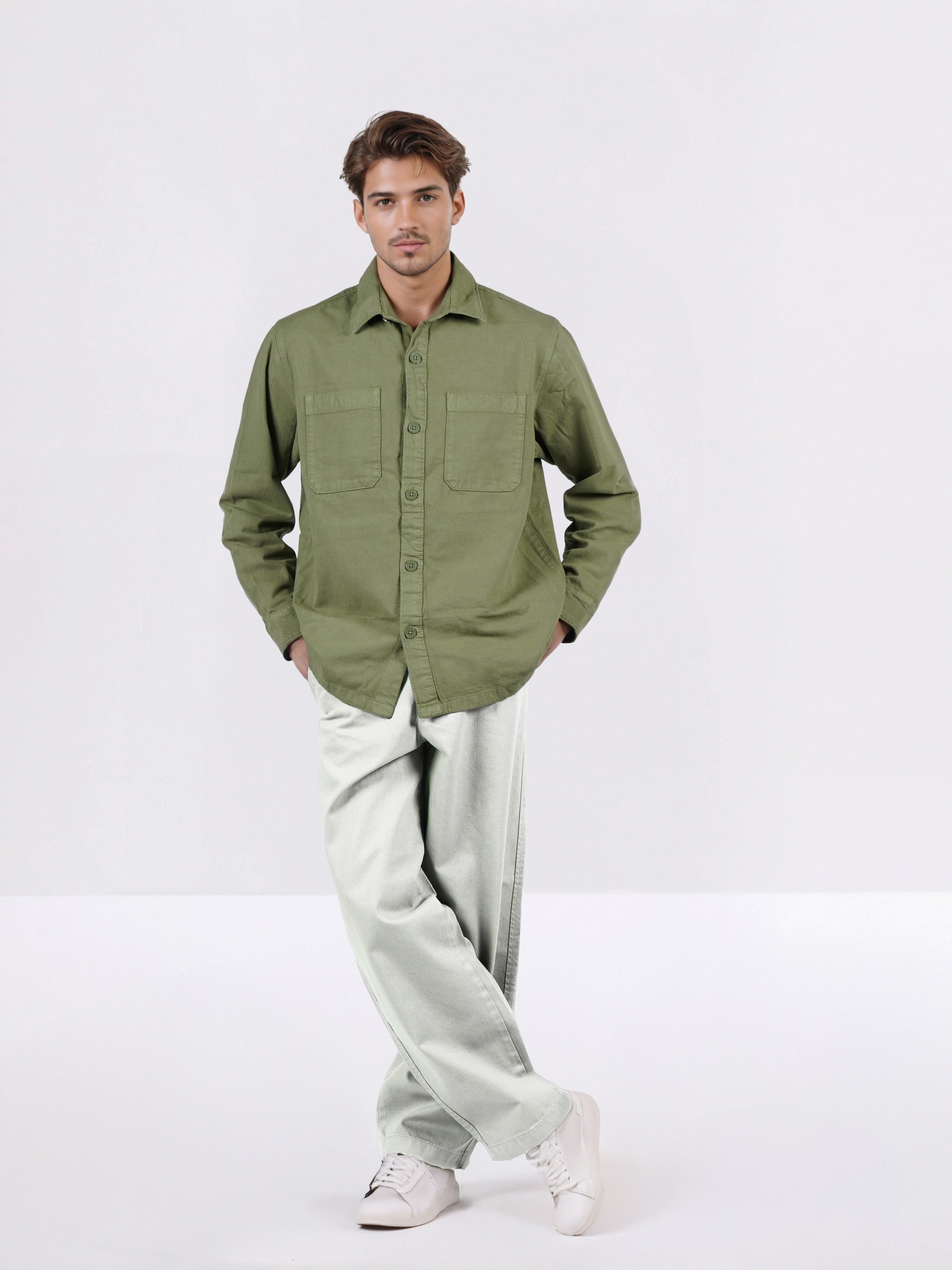Discover the Celio Men Olive Solid Overshirt, made from comfortable cotton. This casual long-sleeve shirt is perfect for a stylish look in any informal setting. Disclaimer: All other items in the image are only for display purposes and will not be a part of the delivery content. Product colour may slightly vary due to photographic lighting sources. Country of Origin - India.