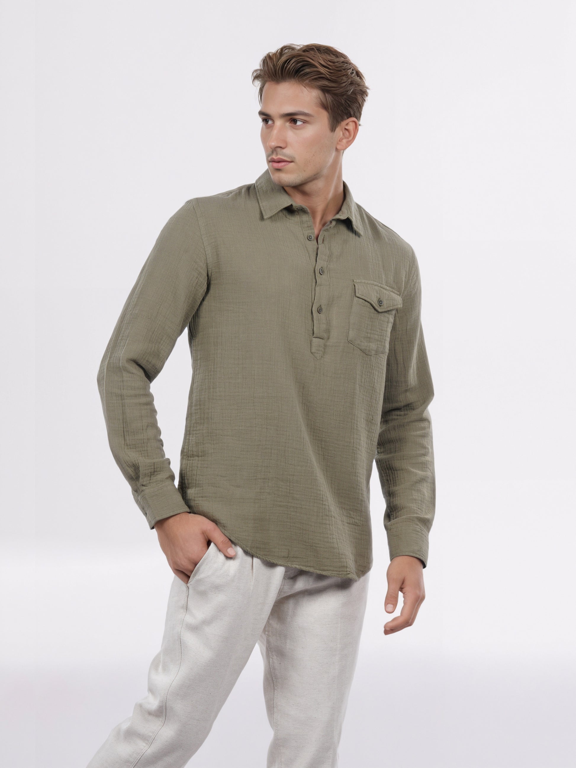 Elevate your casual wardrobe with the Celio Men Olive Solid Shirt. Crafted from comfortable cotton, this regular fit shirt features long sleeves, perfect for any relaxed occasion. Disclaimer: All other items in the image are only for display purposes and will not be a part of the delivery content. Product colour may slightly vary due to photographic lighting sources. Country of Origin - India.