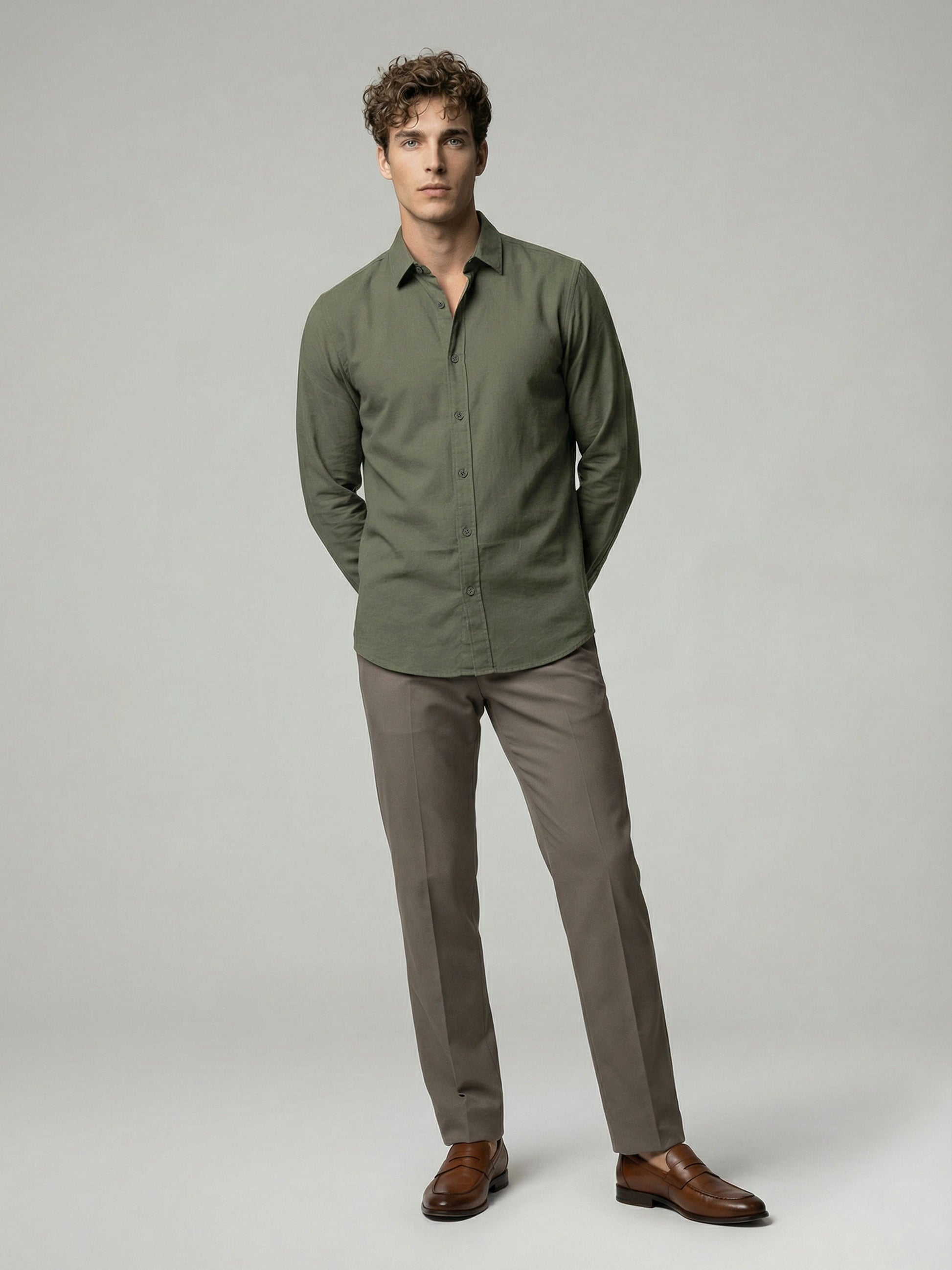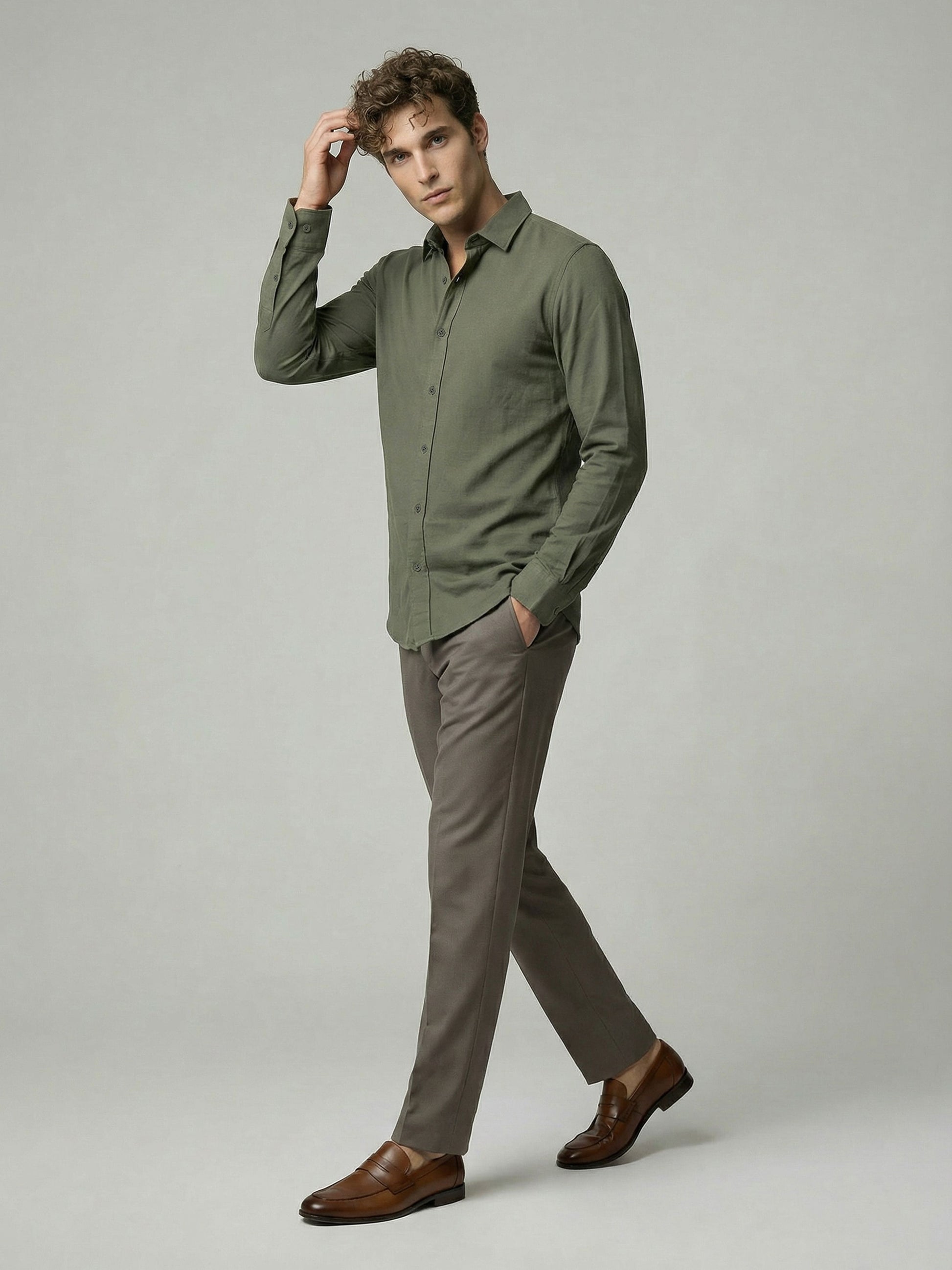 Stylish Celio long-sleeve shirt in olive, crafted from comfortable cotton. Ideal for casual outings, this regular-fit shirt enhances your wardrobe. Disclaimer: All other items in the image are only for display purposes and will not be a part of the delivery content. Product colour may slightly vary due to photographic lighting sources. Country of Origin - India.