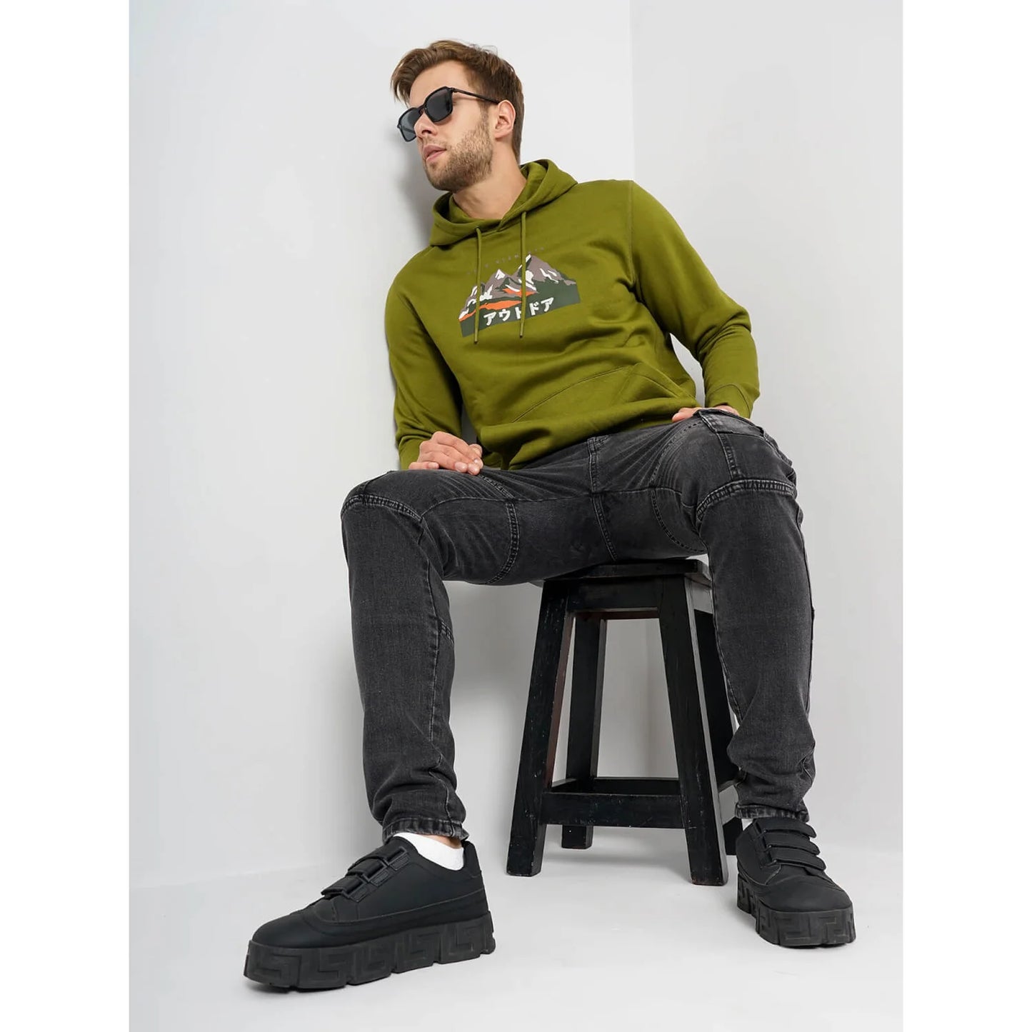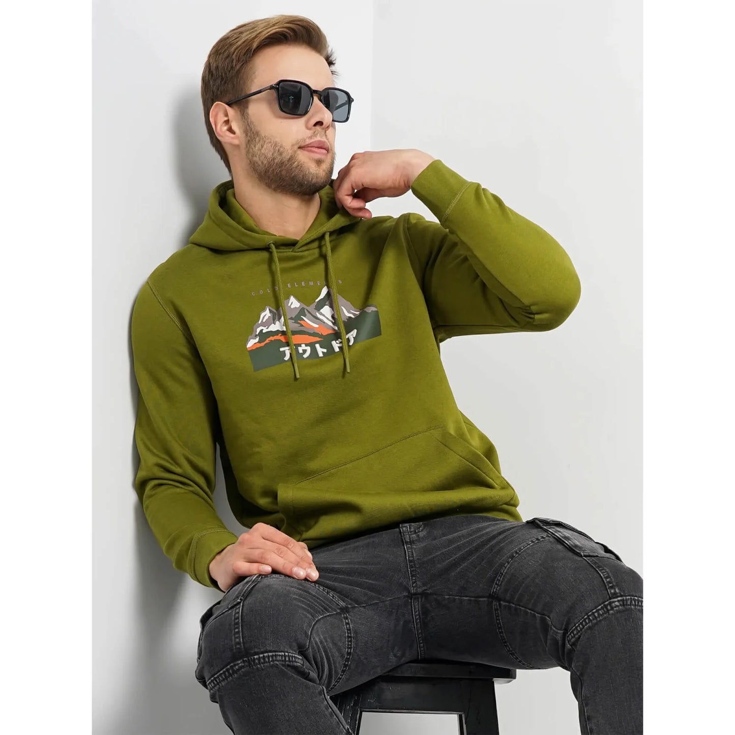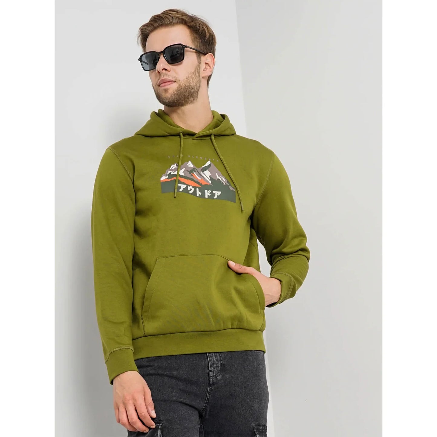Celio Olive Graphic Printed Sweatshirt in Femountain Olive. This casual long-sleeve men's sweater is made from a comfortable cotton blend in a olive color. Disclaimer: All other items in the image are only for display purposes and will not be a part of the delivery content. Product colour may slightly vary due to photographic lighting sources. Country of Origin - India.
