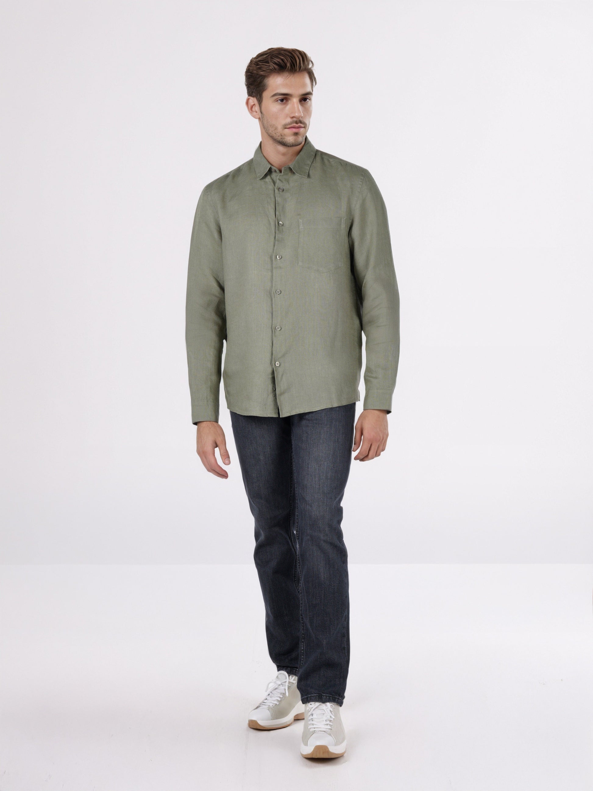 Stylish Celio men’s olive linen shirt featuring long sleeves and a regular fit, perfect for casual occasions. Made from breathable linen fabric for comfort. Disclaimer: All other items in the image are only for display purposes and will not be a part of the delivery content. Product colour may slightly vary due to photographic lighting sources. Country of Origin - India.