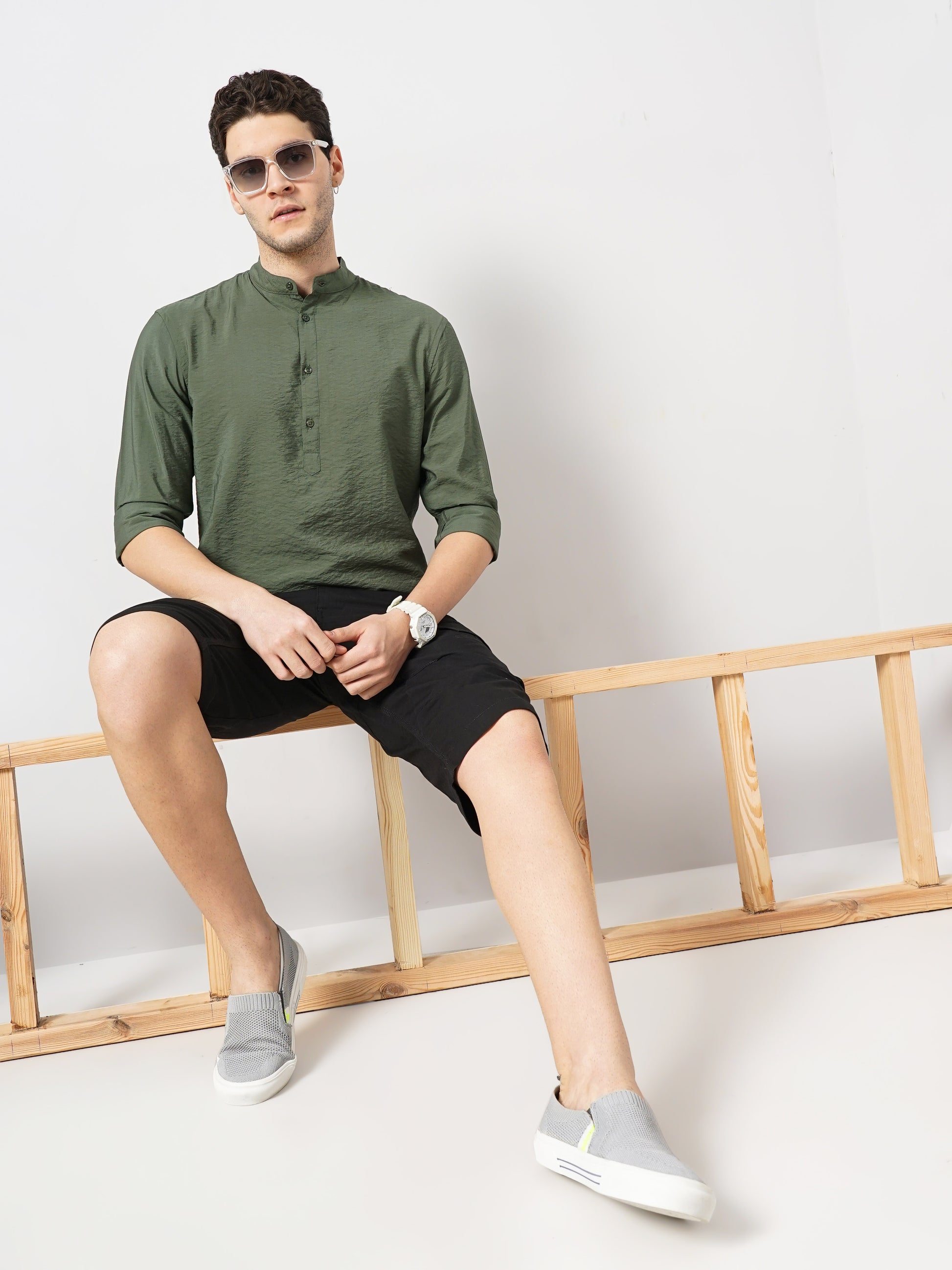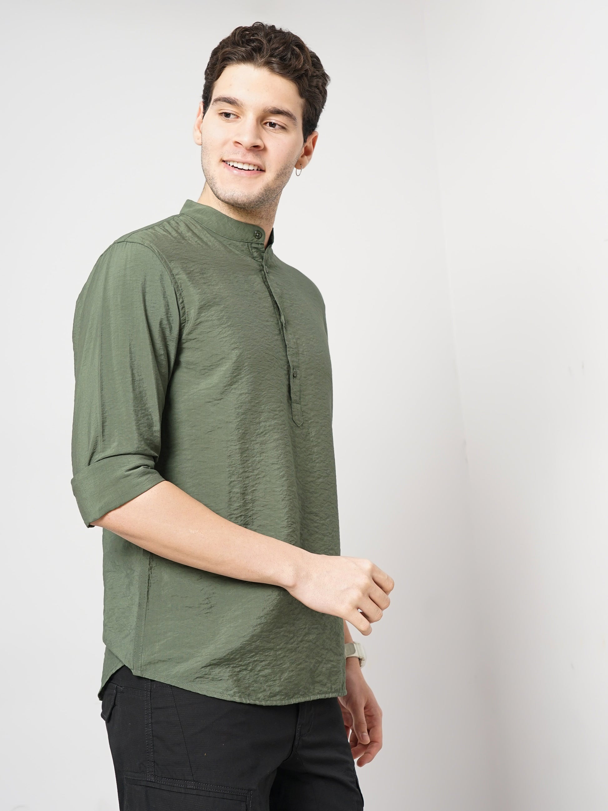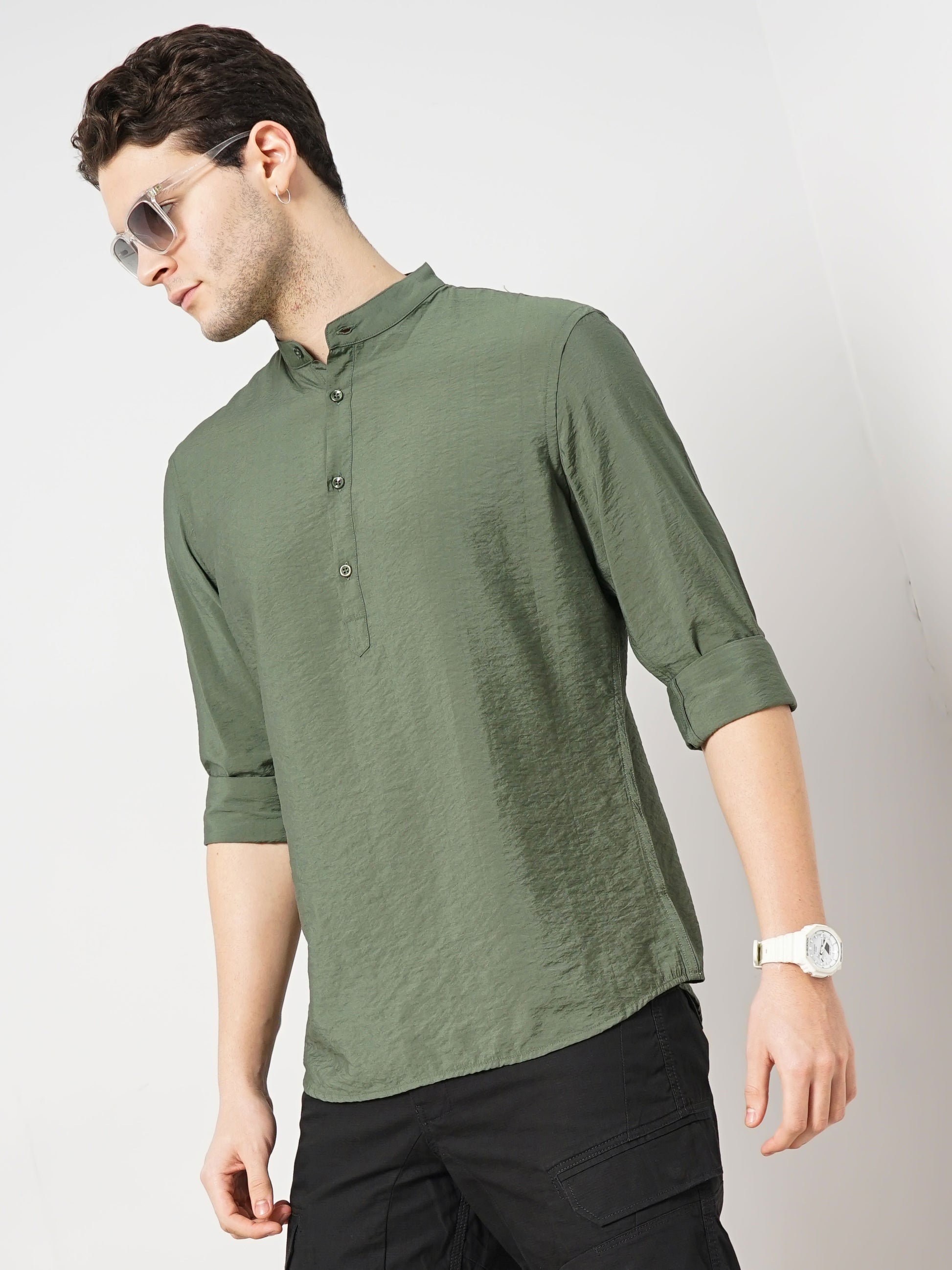 Elevate your casual wardrobe with the Celio Men's Olive Solid Shirt. Made from soft viscose rayon, it features long sleeves and a contemporary regular fit, perfect for any casual occasion. Disclaimer: All other items in the image are only for display purposes and will not be a part of the delivery content. Product colour may slightly vary due to photographic lighting sources. Country of Origin - India.