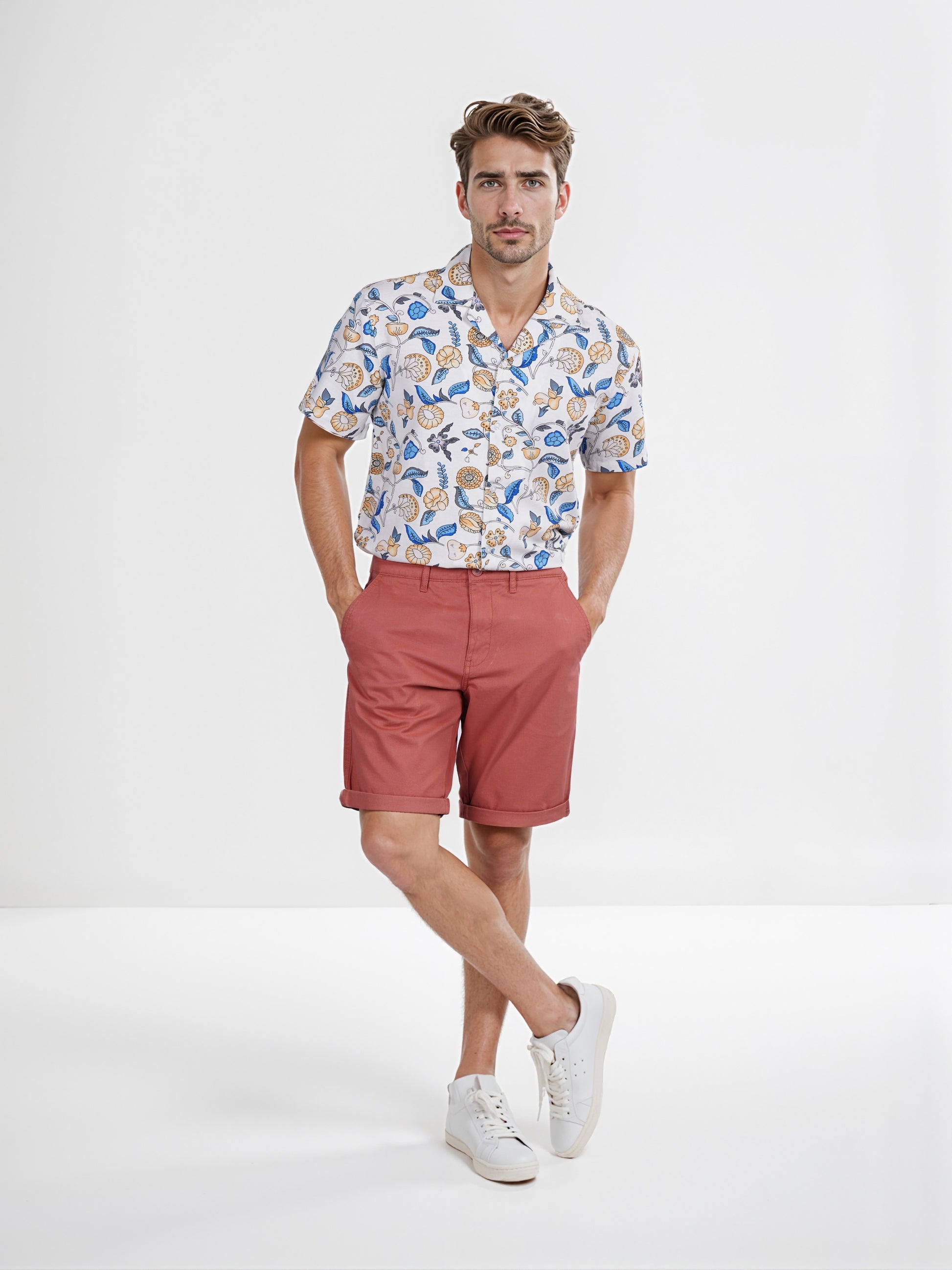 Elevate your casual wardrobe with Celio's orange solid Bermuda shorts. Crafted from comfortable cotton, these regular fit shorts are perfect for any laid-back occasion. Disclaimer: All other items in the image are only for display purposes and will not be a part of the delivery content. Product colour may slightly vary due to photographic lighting sources. Country of Origin - India.