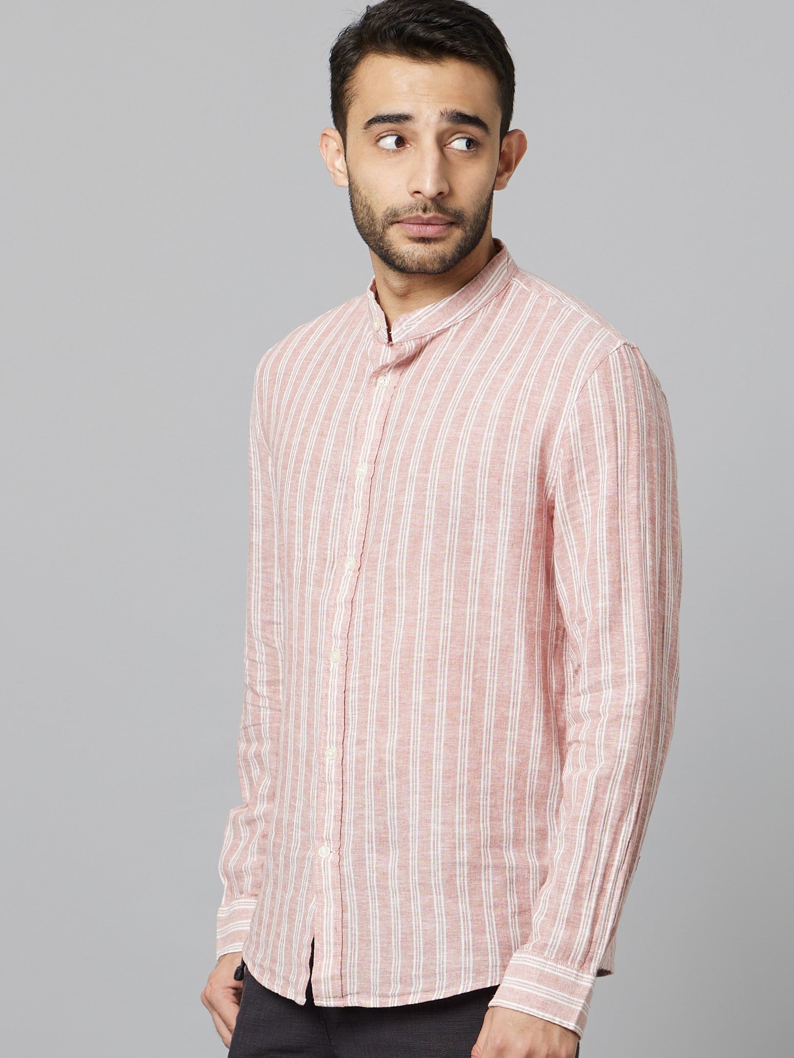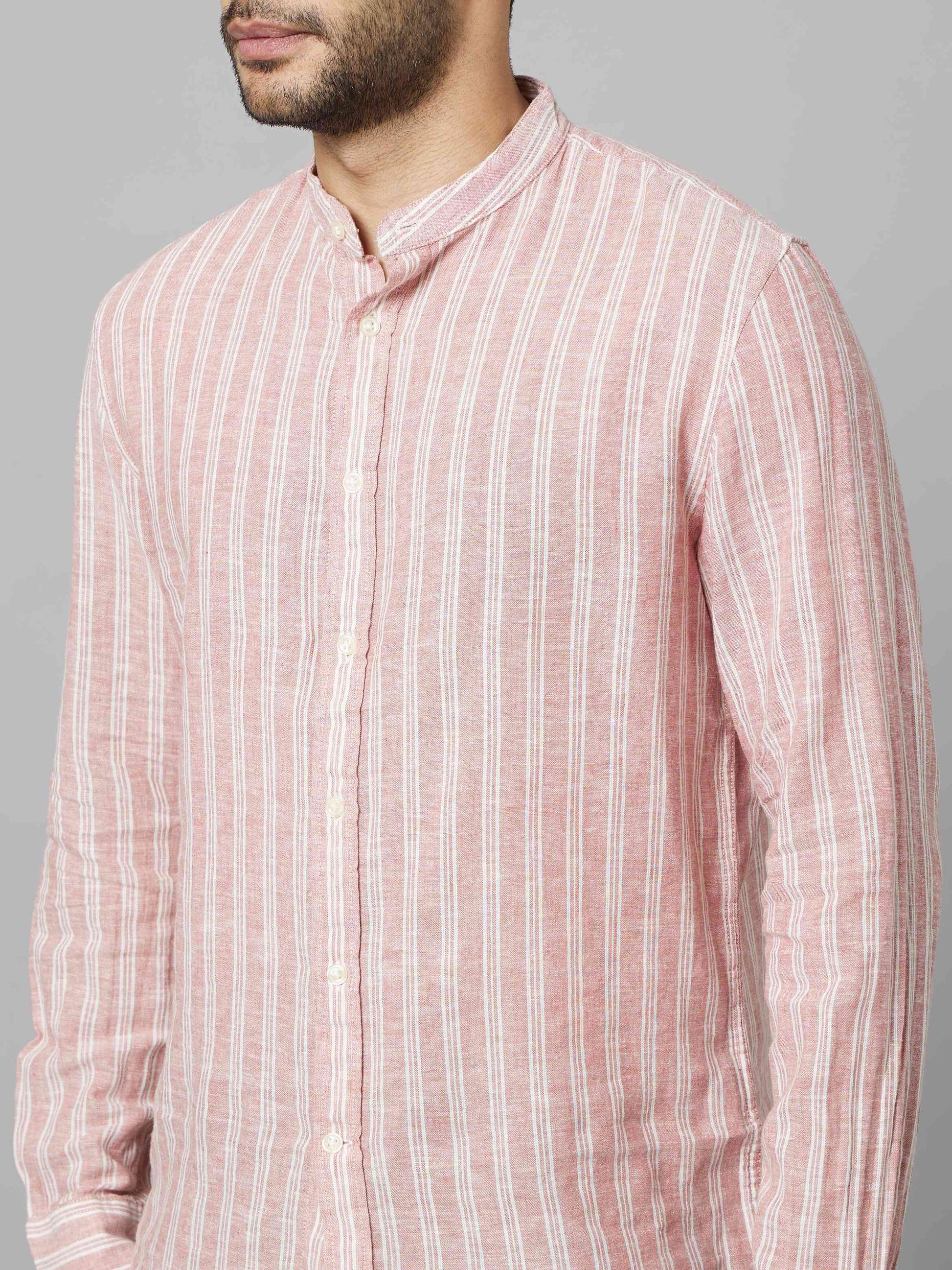 Celio Men Pink Striped Regular Fit Linen Shirts