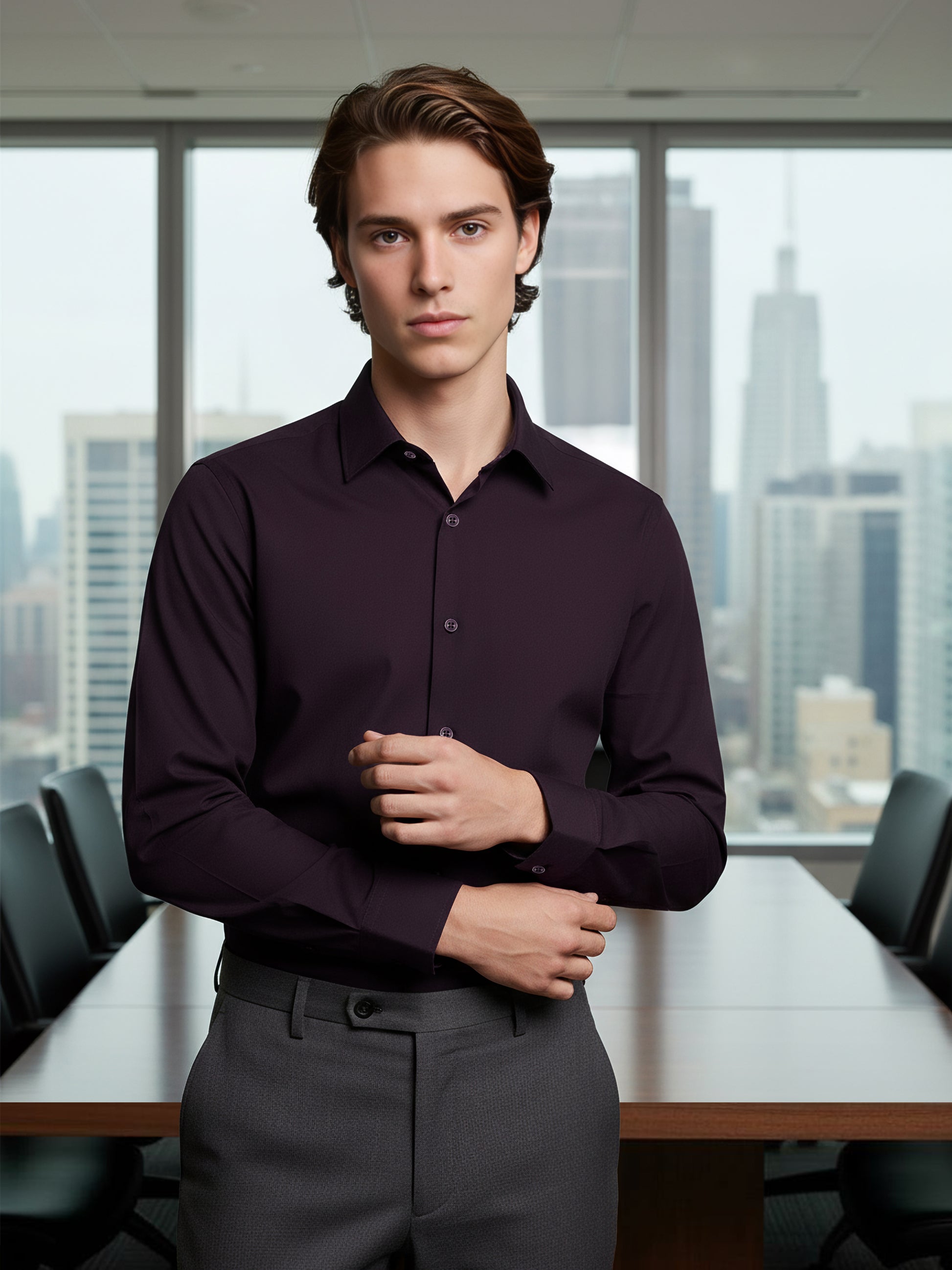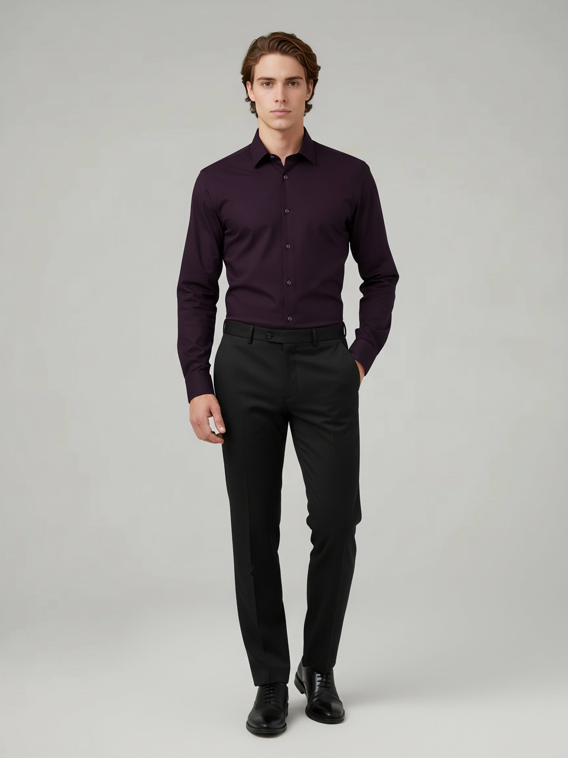 Elevate your casual wardrobe with the Celio Men's Purple Solid Regular Fit Shirt. Made from premium polyester, it features long sleeves and a stylish design for a modern look. Disclaimer: All other items in the image are only for display purposes and will not be a part of the delivery content. Product colour may slightly vary due to photographic lighting sources. Country of Origin - India.