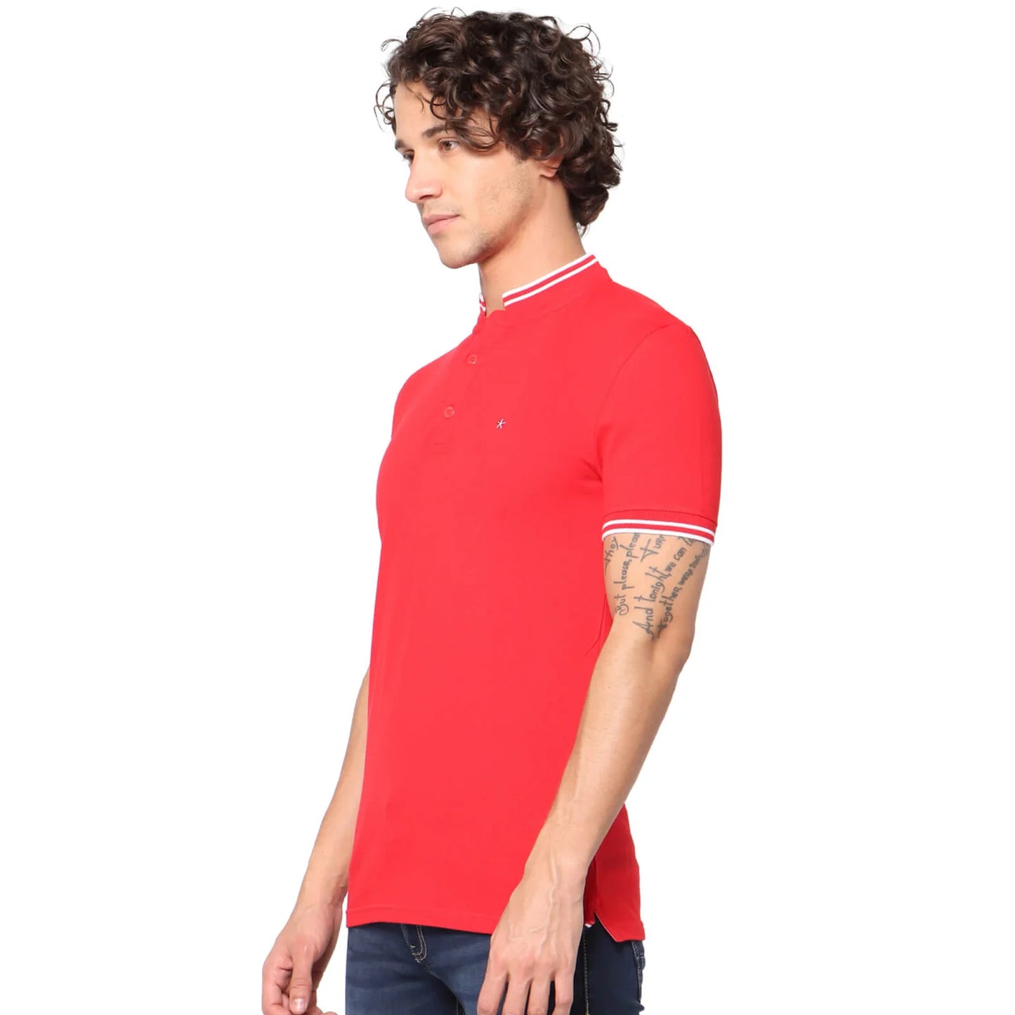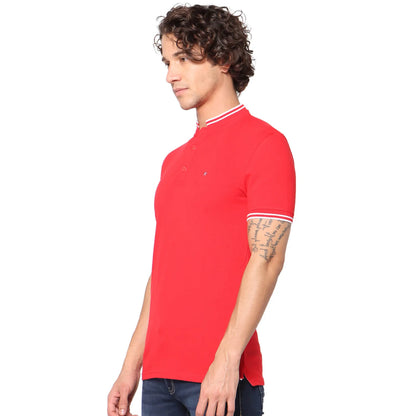 This Celio Men's Polo T-Shirt in vibrant Teflashy1 Red features a comfortable cotton blend fabric, perfect for casual occasions. Designed with short sleeves, it’s ideal for a stylish look. Disclaimer: All other items in the image are only for display purposes and will not be a part of the delivery content. Product colour may slightly vary due to photographic lighting sources. Country of Origin - India.