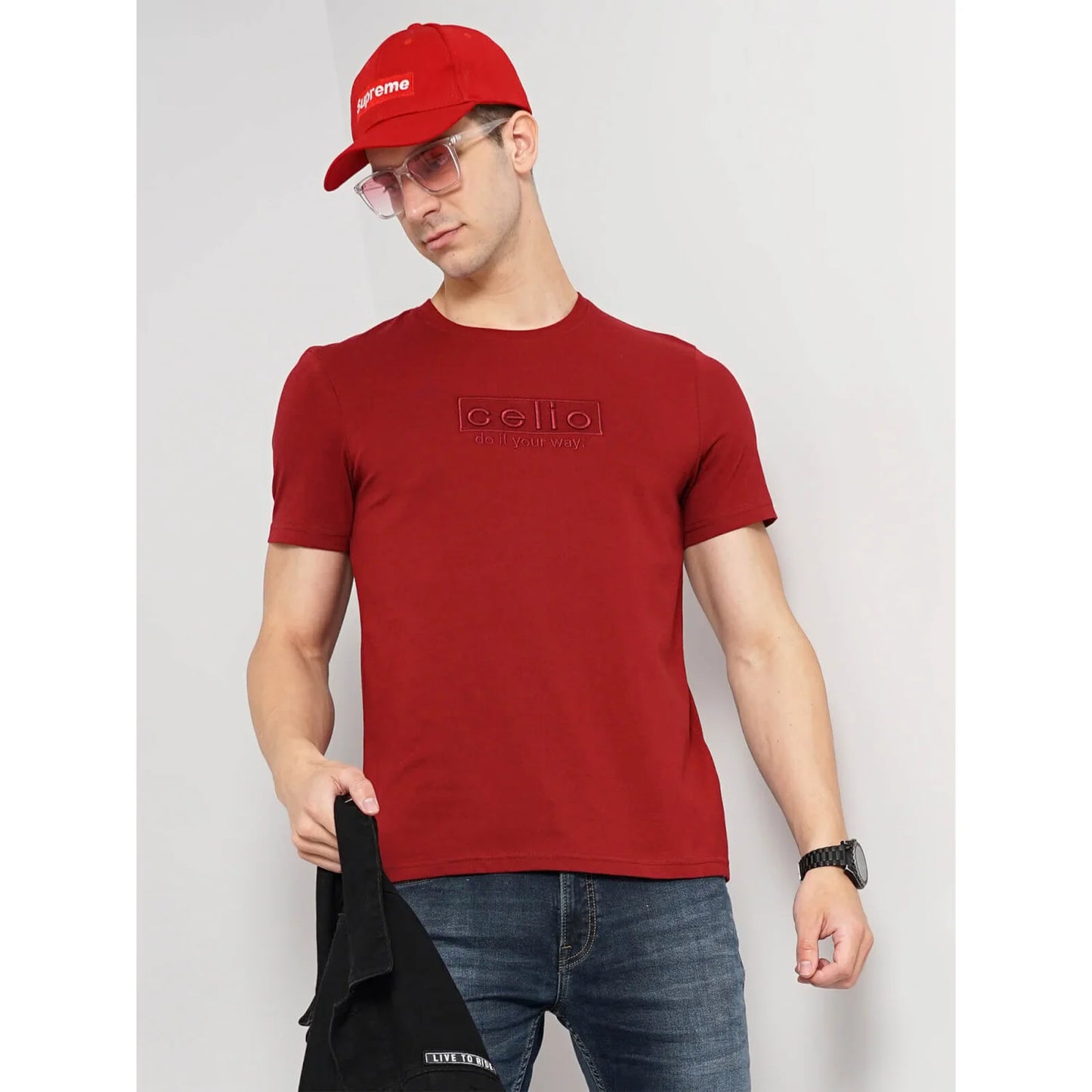 Shop the Celio Red Cotton Graphic Tee in Feembro Burgundy. This Red-colored, half-sleeve tee is perfect for casual occasions, designed for men and made from soft cotton fabric. Disclaimer: All other items in the image are only for display purposes and will not be a part of the delivery content. Product colour may slightly vary due to photographic lighting sources. Country of Origin - India.