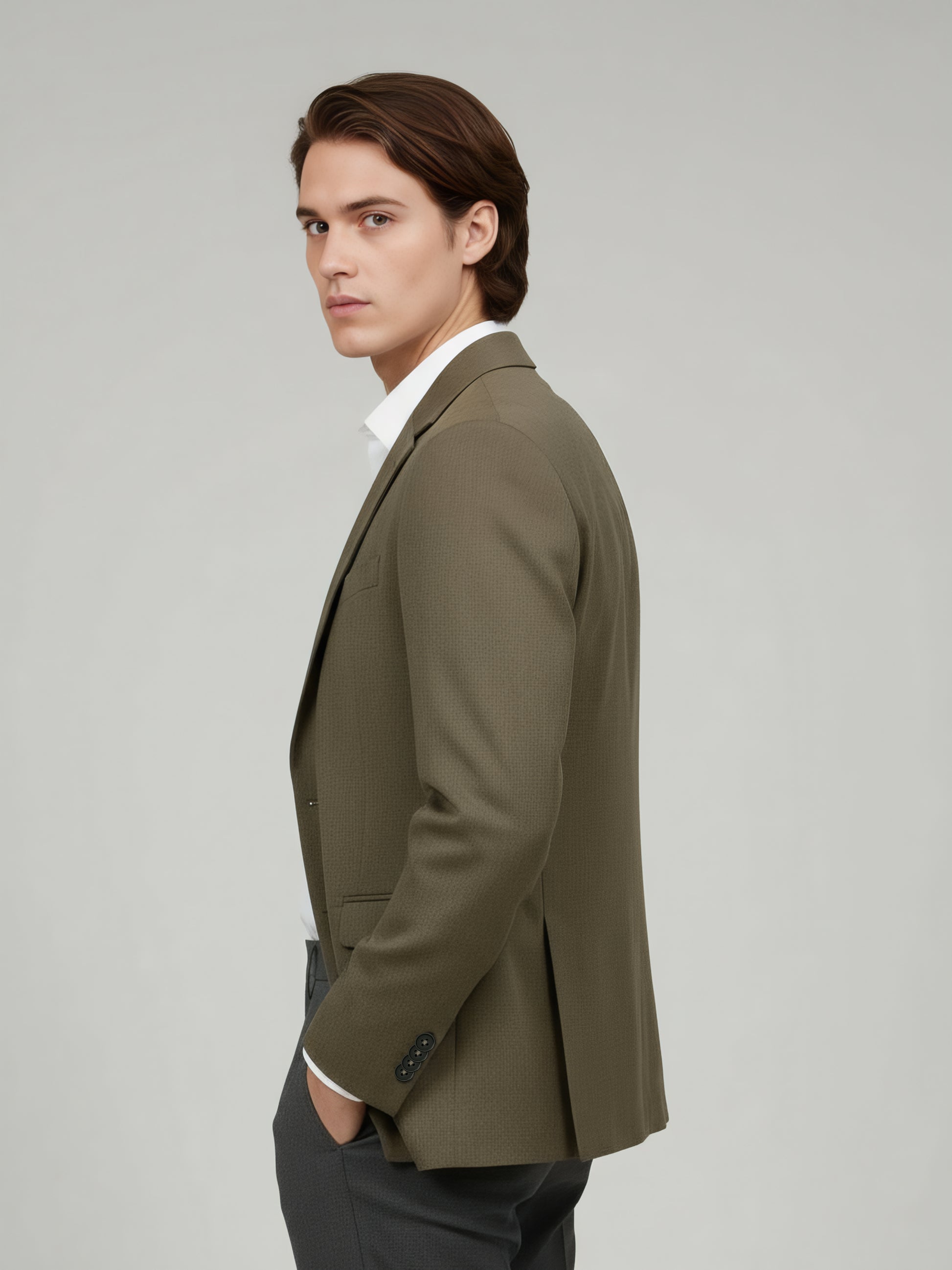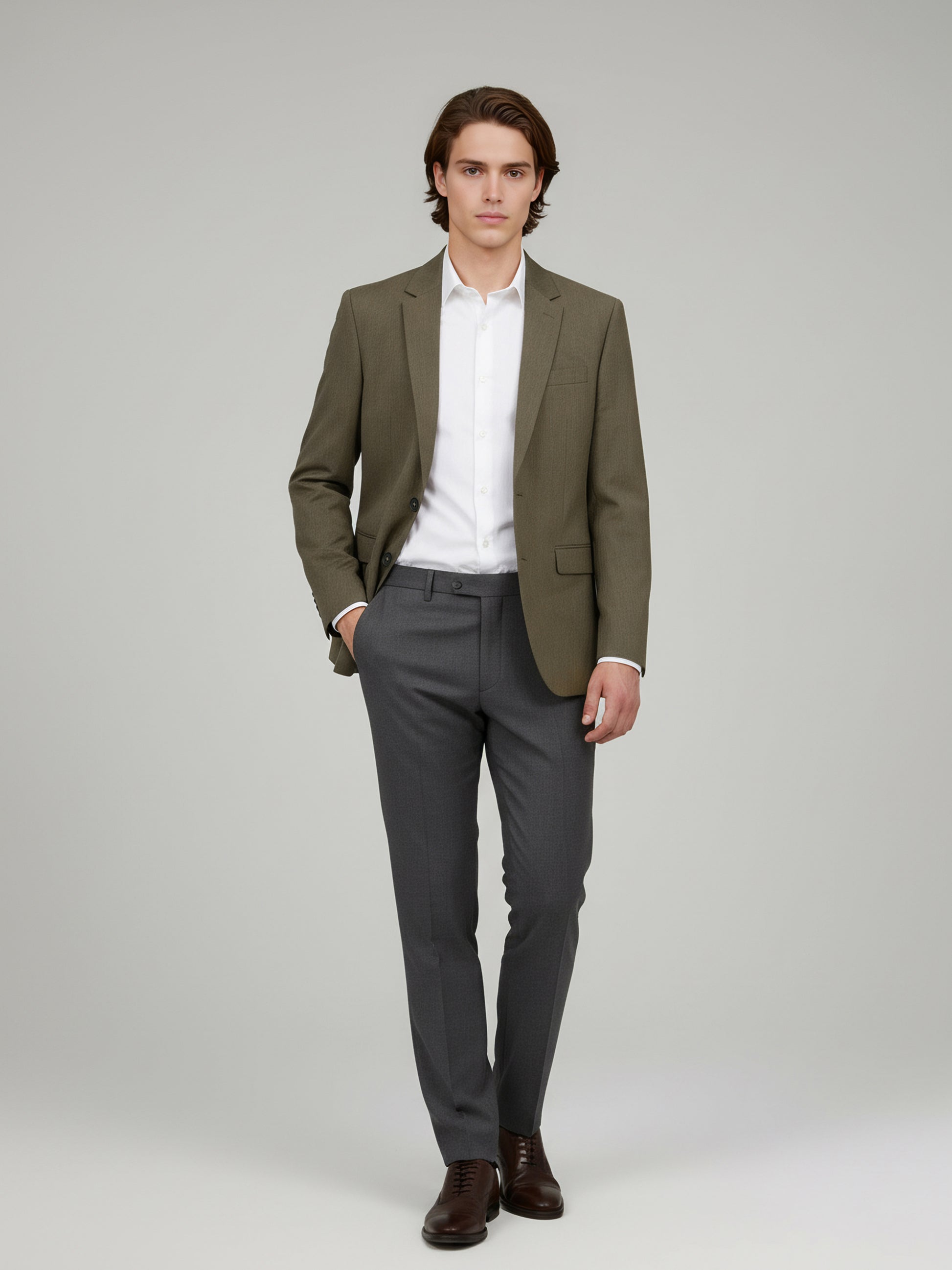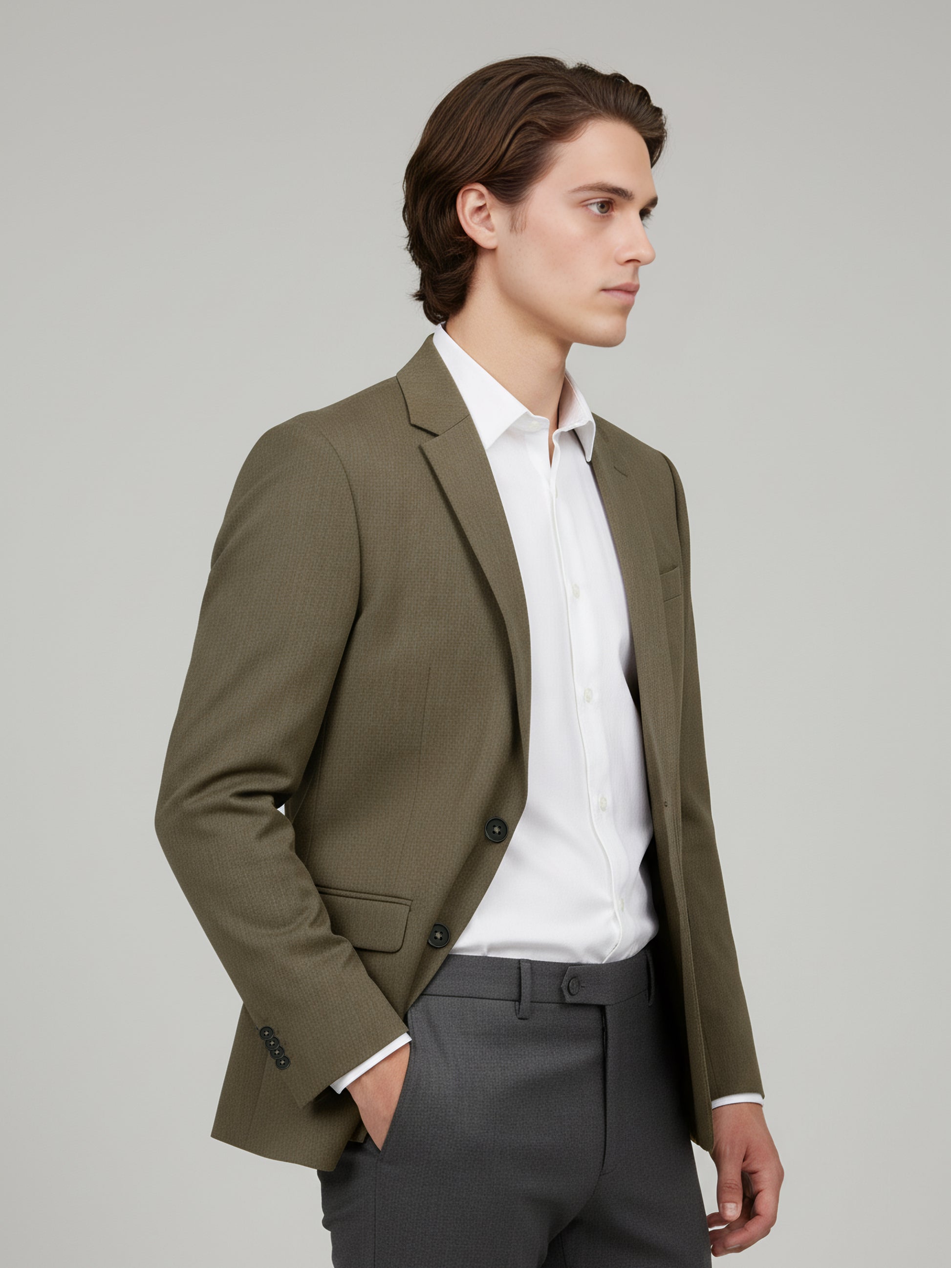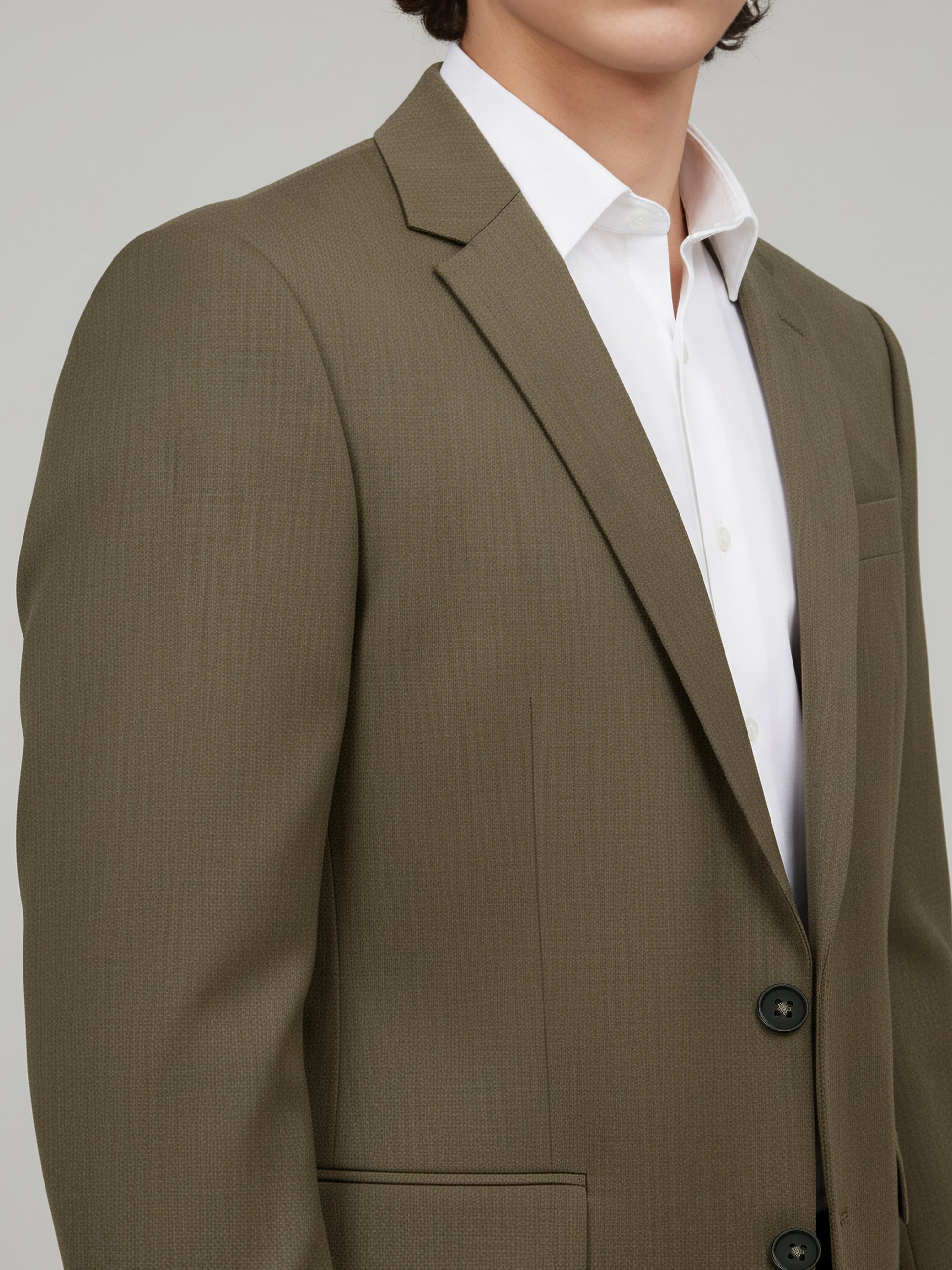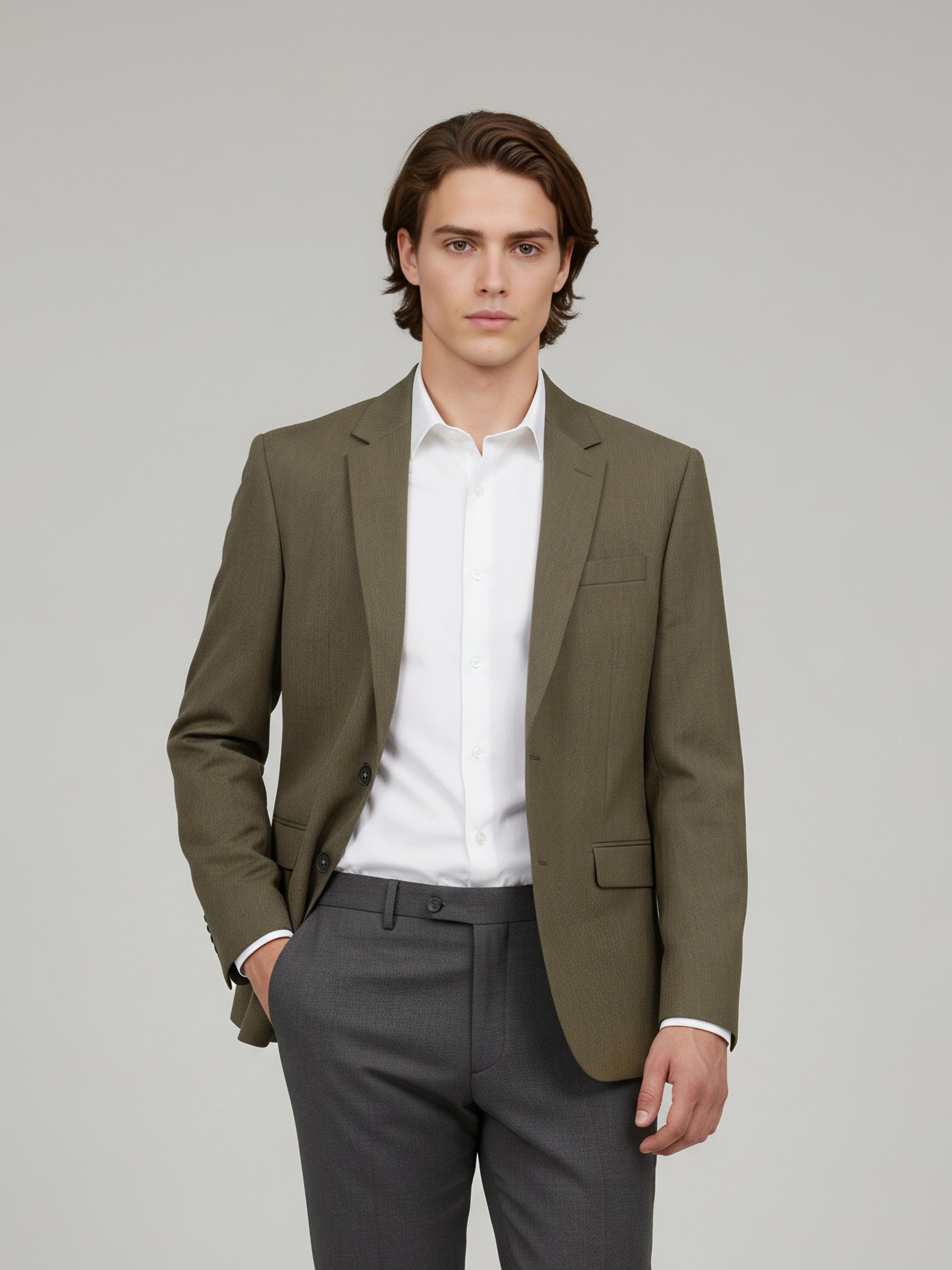 Elevate your casual style with the Celio Men Taupe Solid Slim Fit Jacket. Crafted from a blend of polyester, wool, and elastane, it features long sleeves for a modern look. Disclaimer: All other items in the image are only for display purposes and will not be a part of the delivery content. Product colour may slightly vary due to photographic lighting sources. Country of Origin - India.