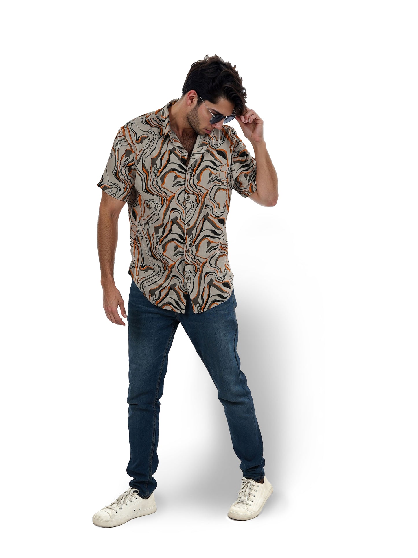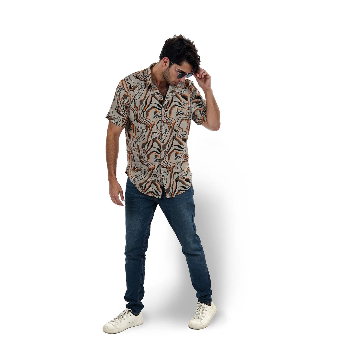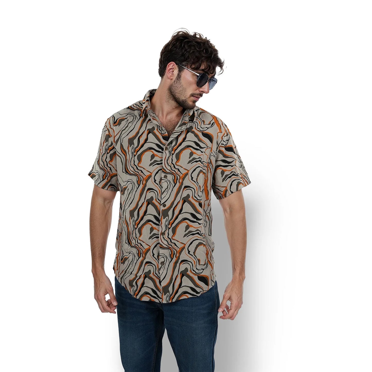 Elevate your casual wardrobe with this soft touch taupe shirt from Celio. Crafted in viscose rayon, it features a stylish spread collar and short sleeves for a relaxed look. Disclaimer: All other items in the image are only for display purposes and will not be a part of the delivery content. Product colour may slightly vary due to photographic lighting sources. Country of Origin - India.