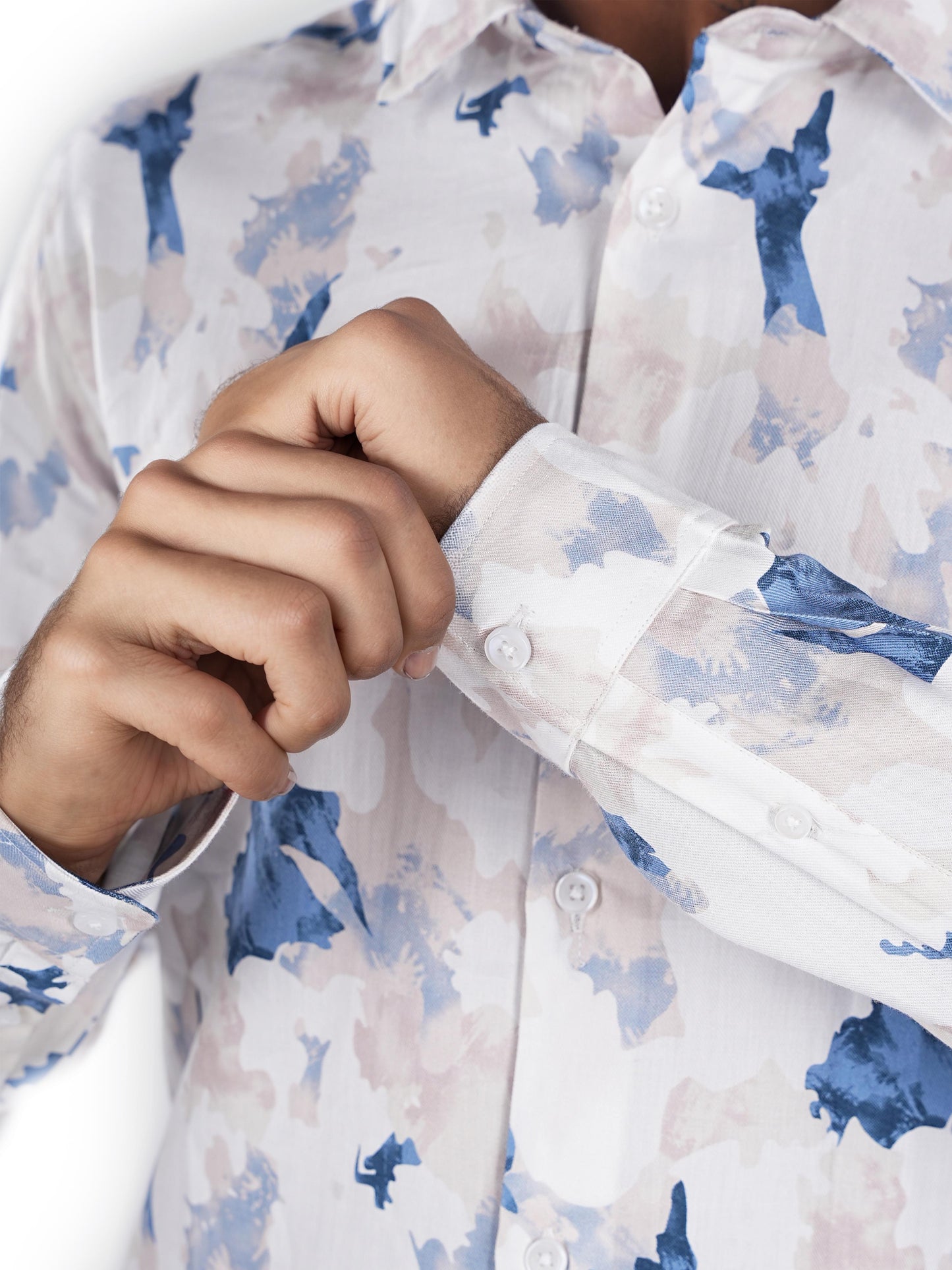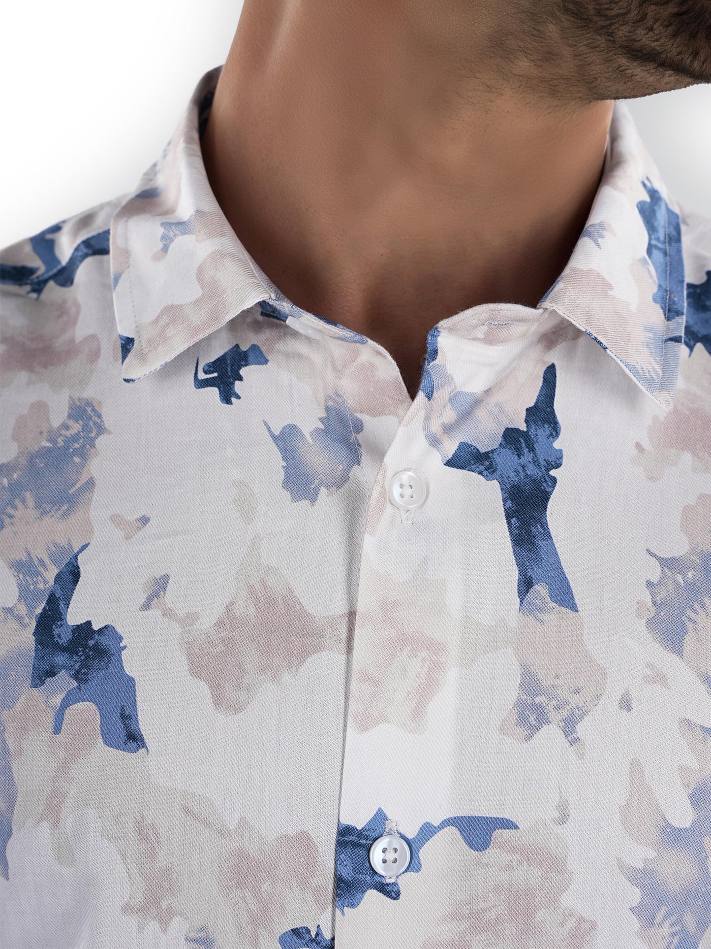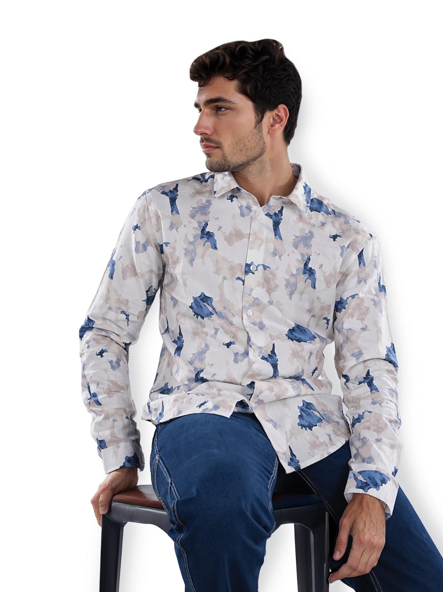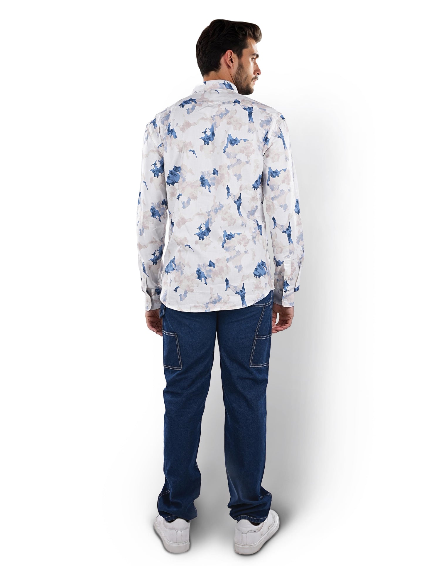 Men's regular fit white cotton shirt by Celio features a festive printed design, long sleeves, and is perfect for casual occasions. Disclaimer: All other items in the image are only for display purposes and will not be a part of the delivery content. Product colour may slightly vary due to photographic lighting sources. Country of Origin - India.