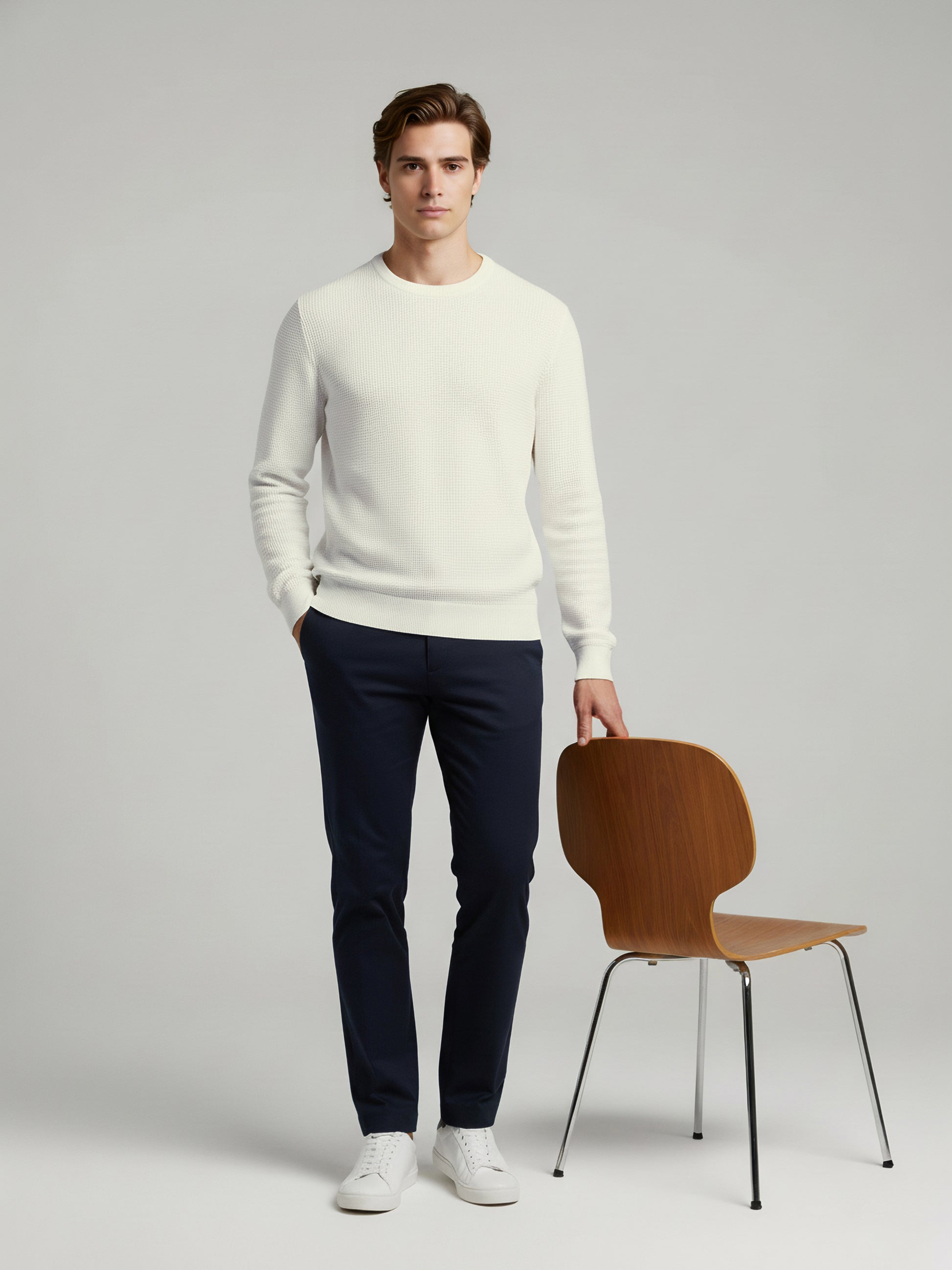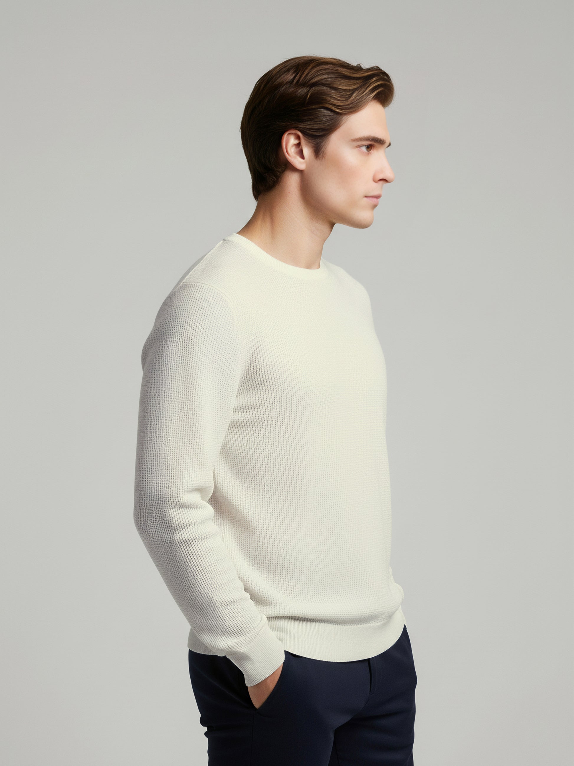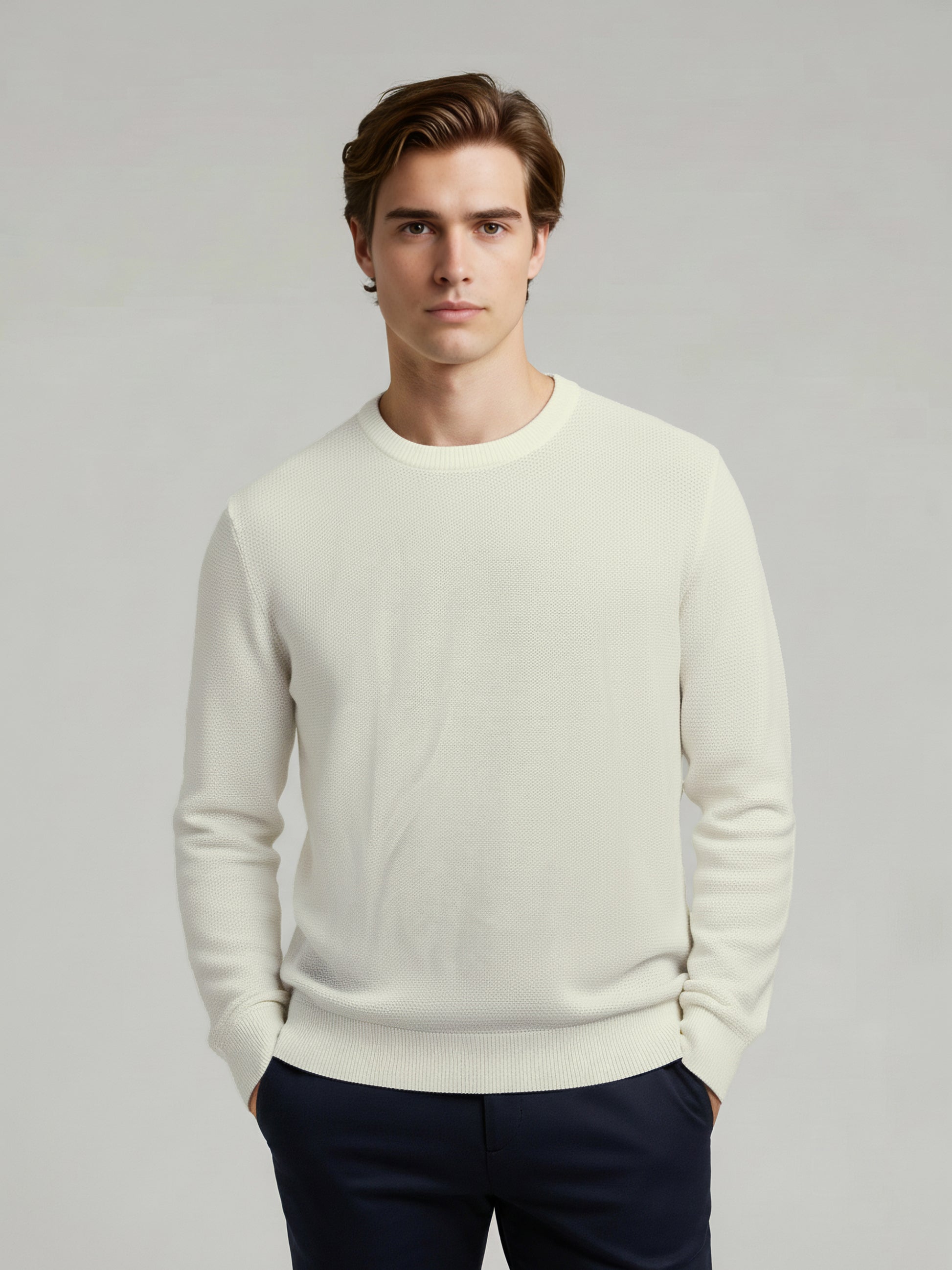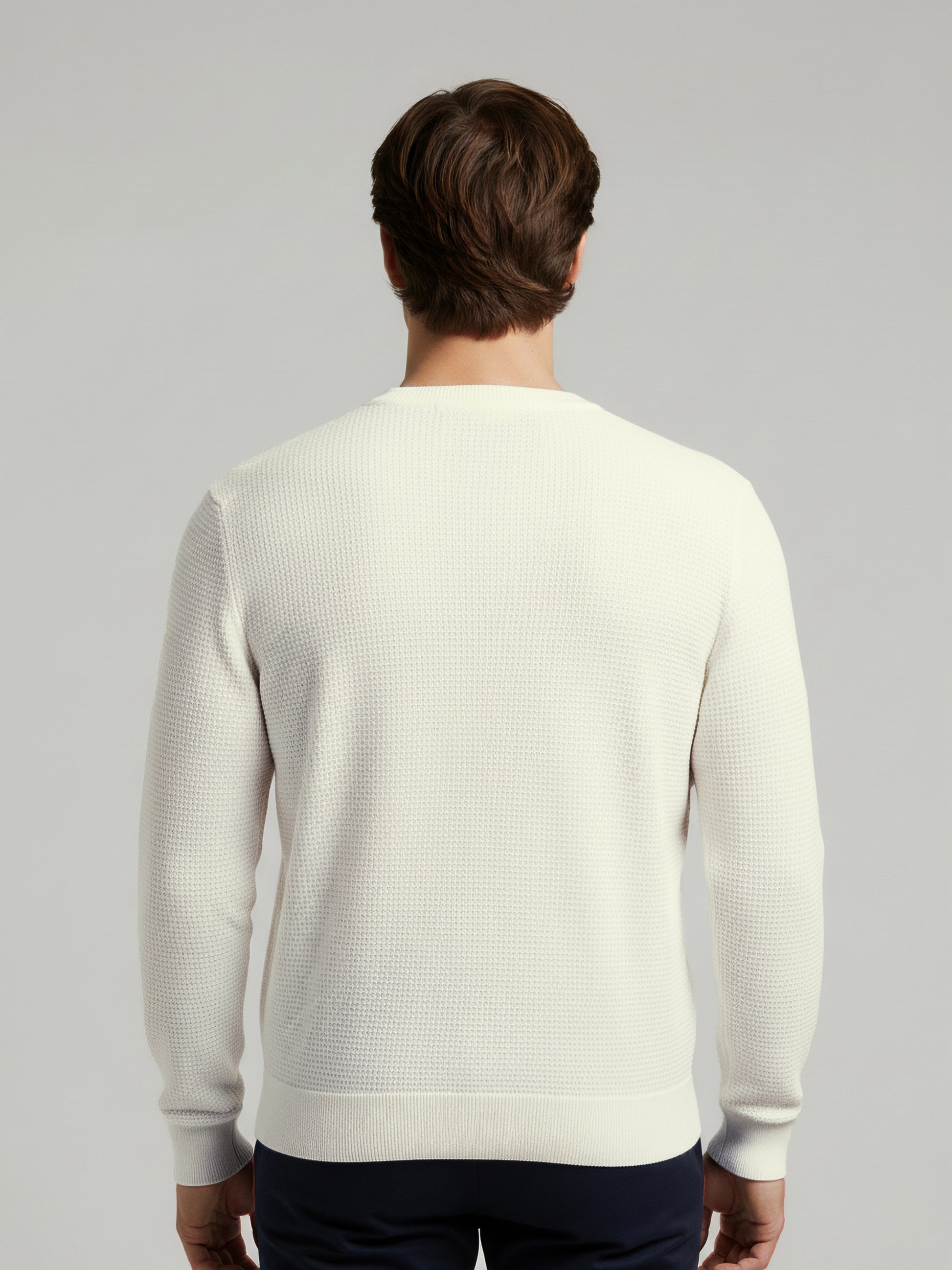 Stay comfortable and stylish with the Celio Men White Solid Sweater. This regular fit cotton piece features long sleeves, perfect for casual occasions. Disclaimer: All other items in the image are only for display purposes and will not be a part of the delivery content. Product colour may slightly vary due to photographic lighting sources. Country of Origin - India.