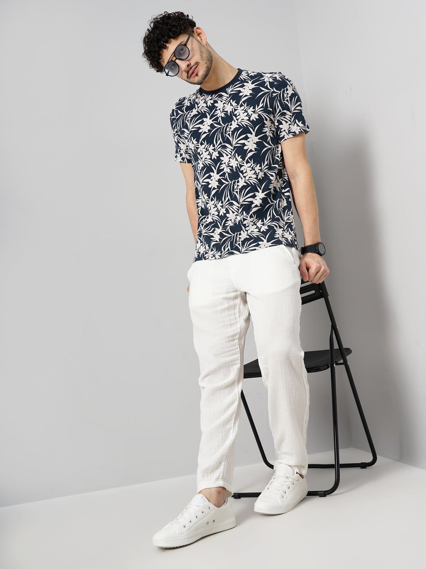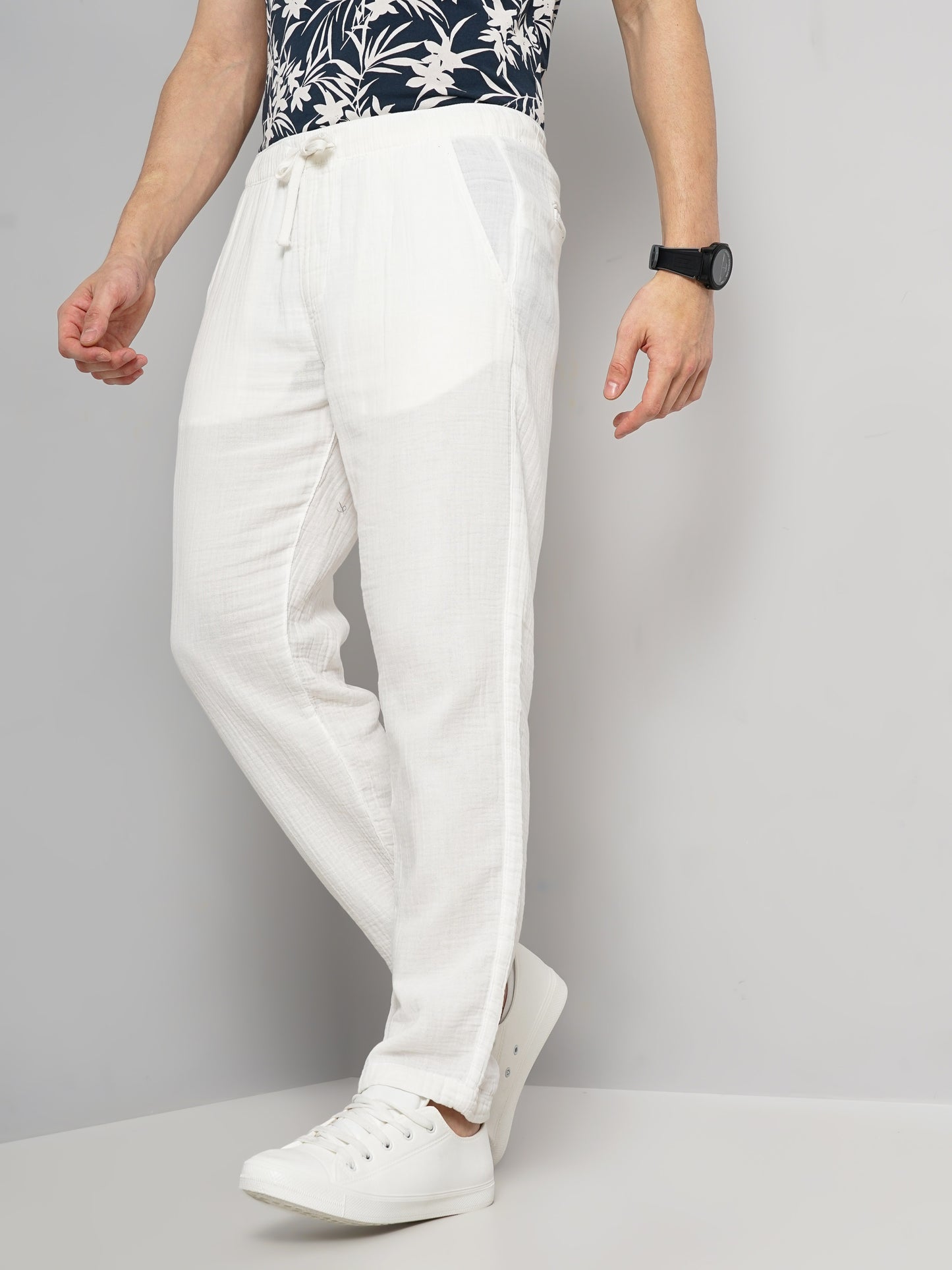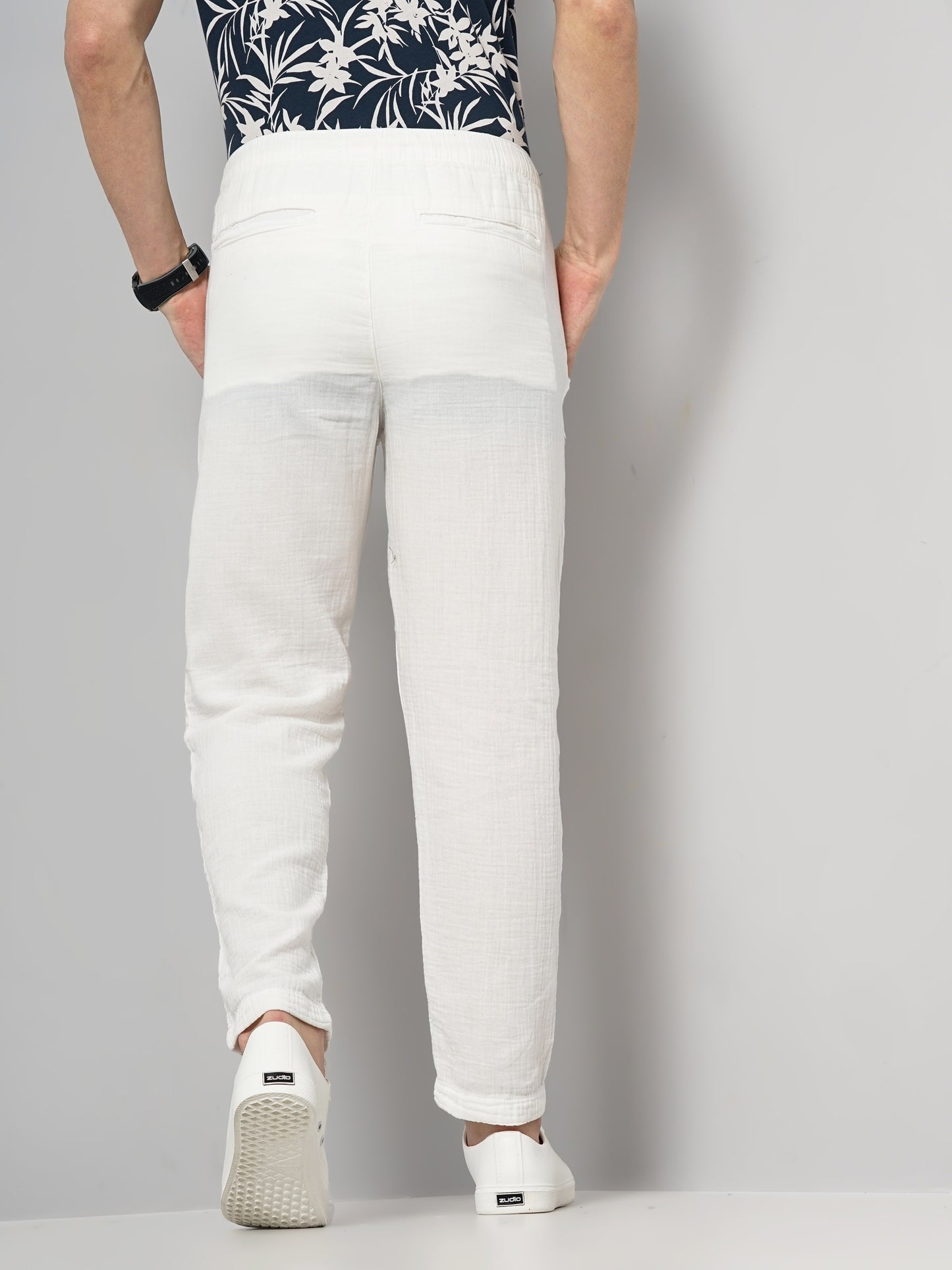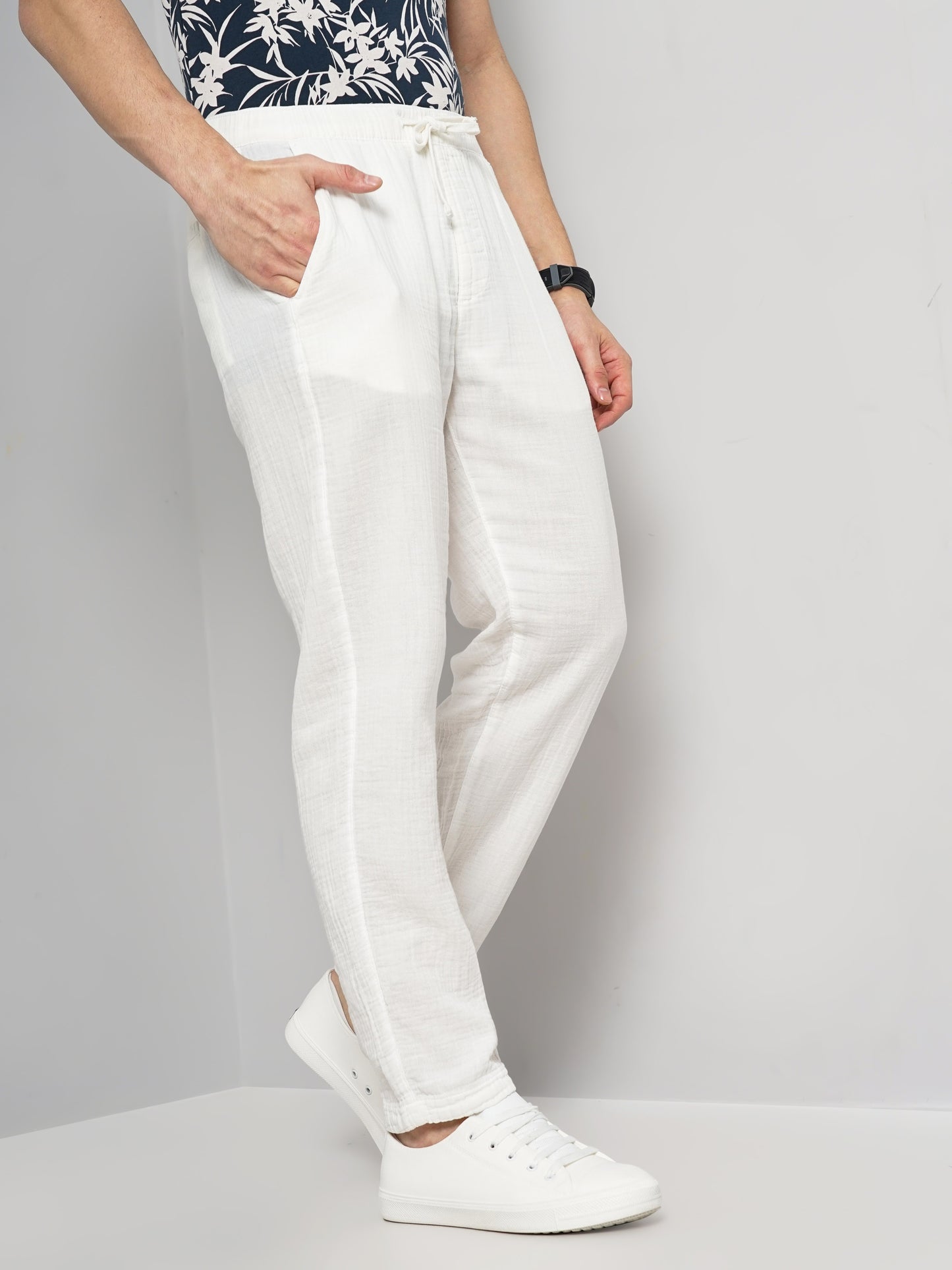 Explore style with Celio's men solid slim fit Trouser in white. Crafted from quality cotton, these casual pants are perfect for everyday wear. Disclaimer: All other items in the image are only for display purposes and will not be a part of the delivery content. Product colour may slightly vary due to photographic lighting sources. Country of Origin - India.