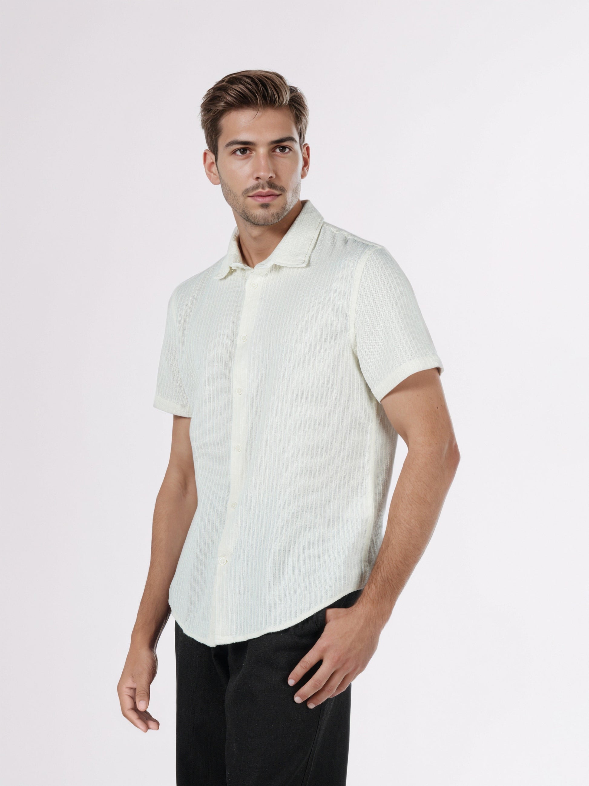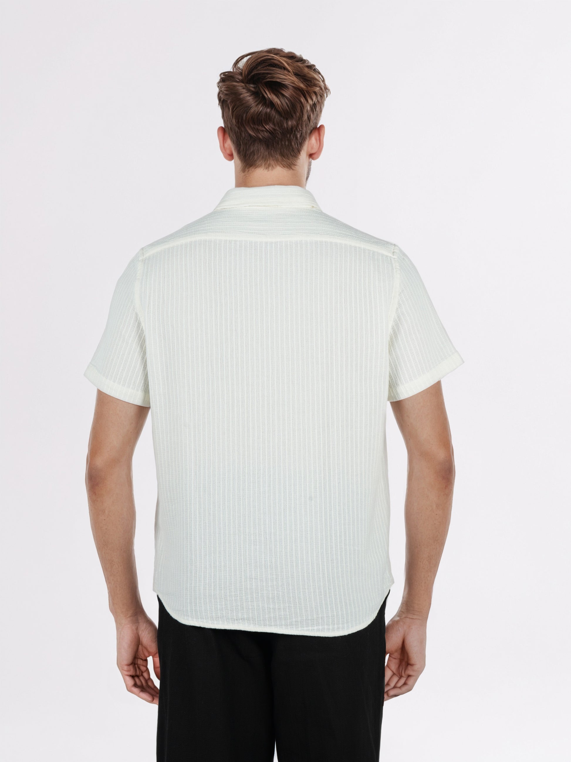 Stylish Celio men's casual shirt in white features regular fit, long sleeves, and a striped design, crafted from comfortable cotton for a relaxed look. Disclaimer: All other items in the image are only for display purposes and will not be a part of the delivery content. Product colour may slightly vary due to photographic lighting sources. Country of Origin - India.