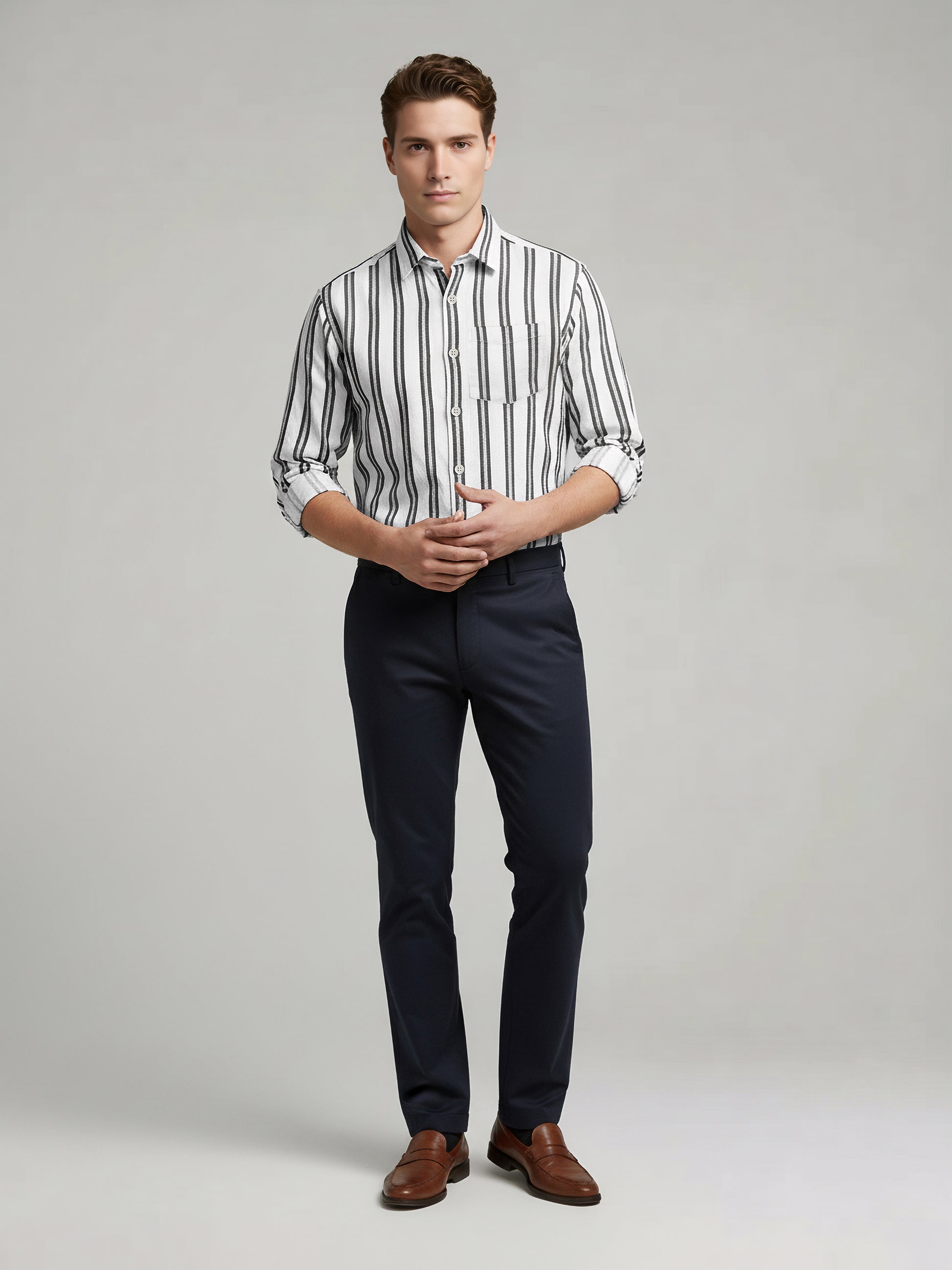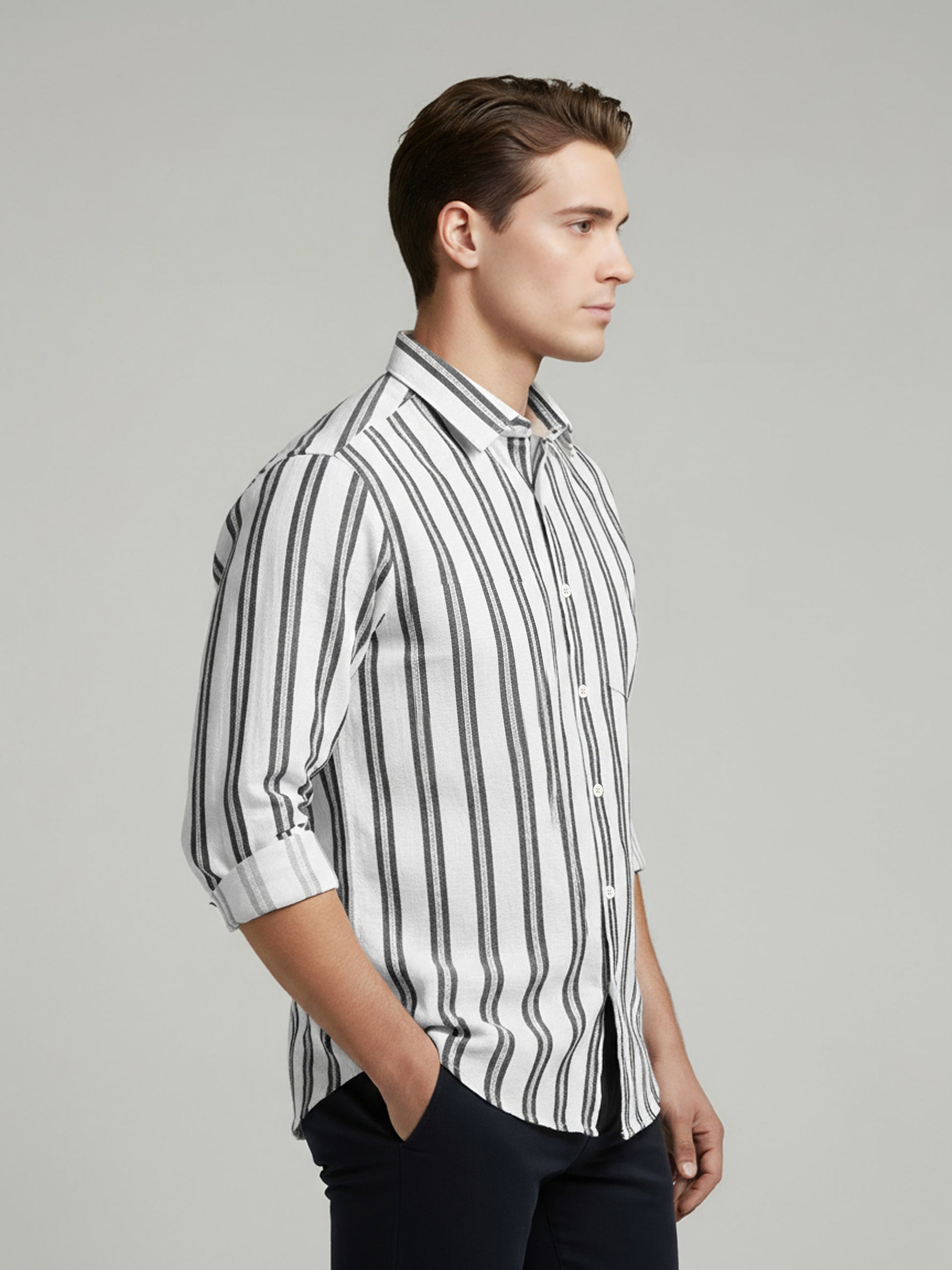 Discover casual elegance with the Celio Men White Striped Shirt. Crafted from cotton, it features a regular fit and versatile roll-up sleeves, perfect for stylish outings. Disclaimer: All other items in the image are only for display purposes and will not be a part of the delivery content. Product colour may slightly vary due to photographic lighting sources. Country of Origin - India.