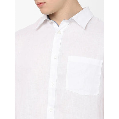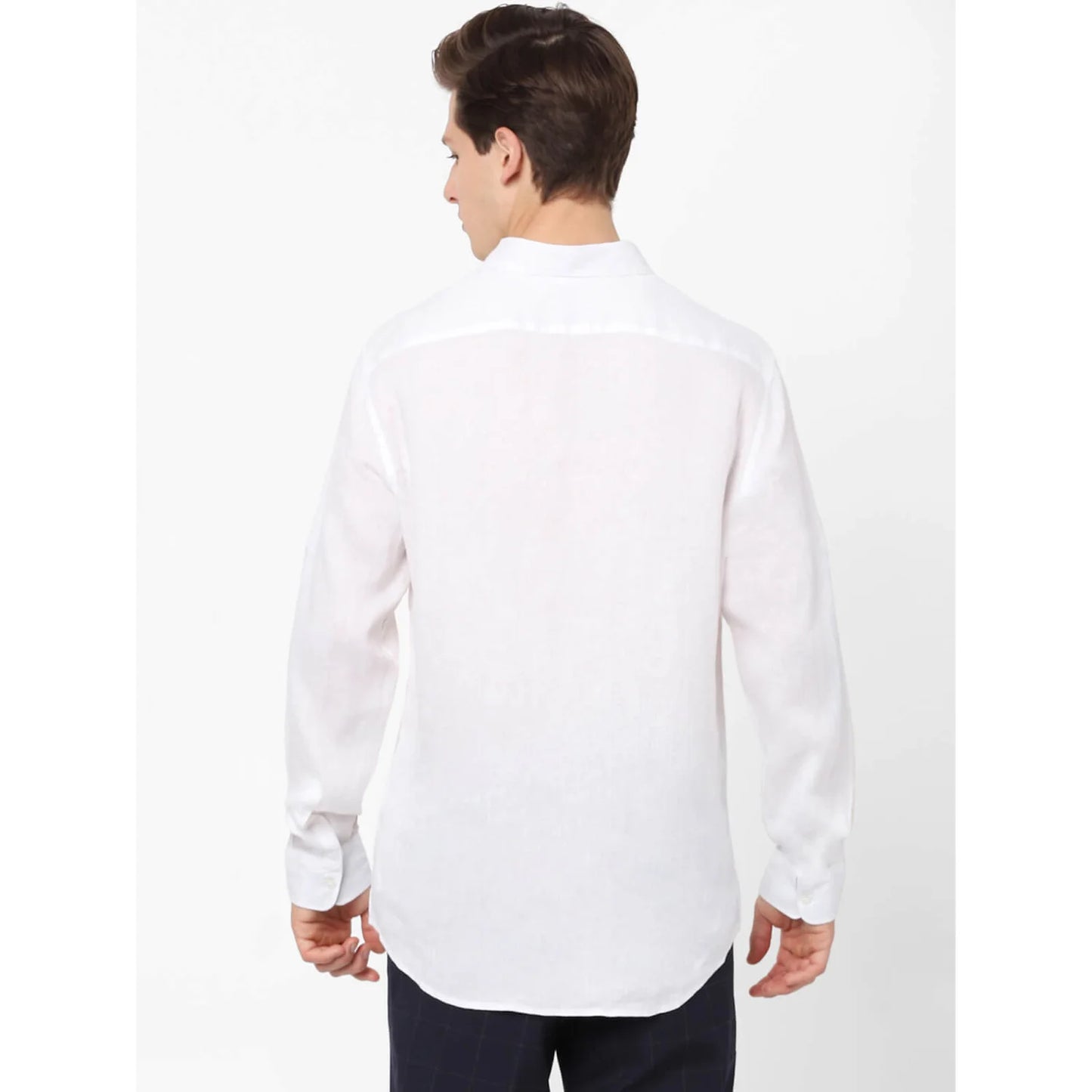 Stylish Celio men's shirt in solid white, crafted from linen for a casual look. Features long sleeves, perfect for various occasions. Disclaimer: All other items in the image are only for display purposes and will not be a part of the delivery content. Product colour may slightly vary due to photographic lighting sources. Country of Origin - India.