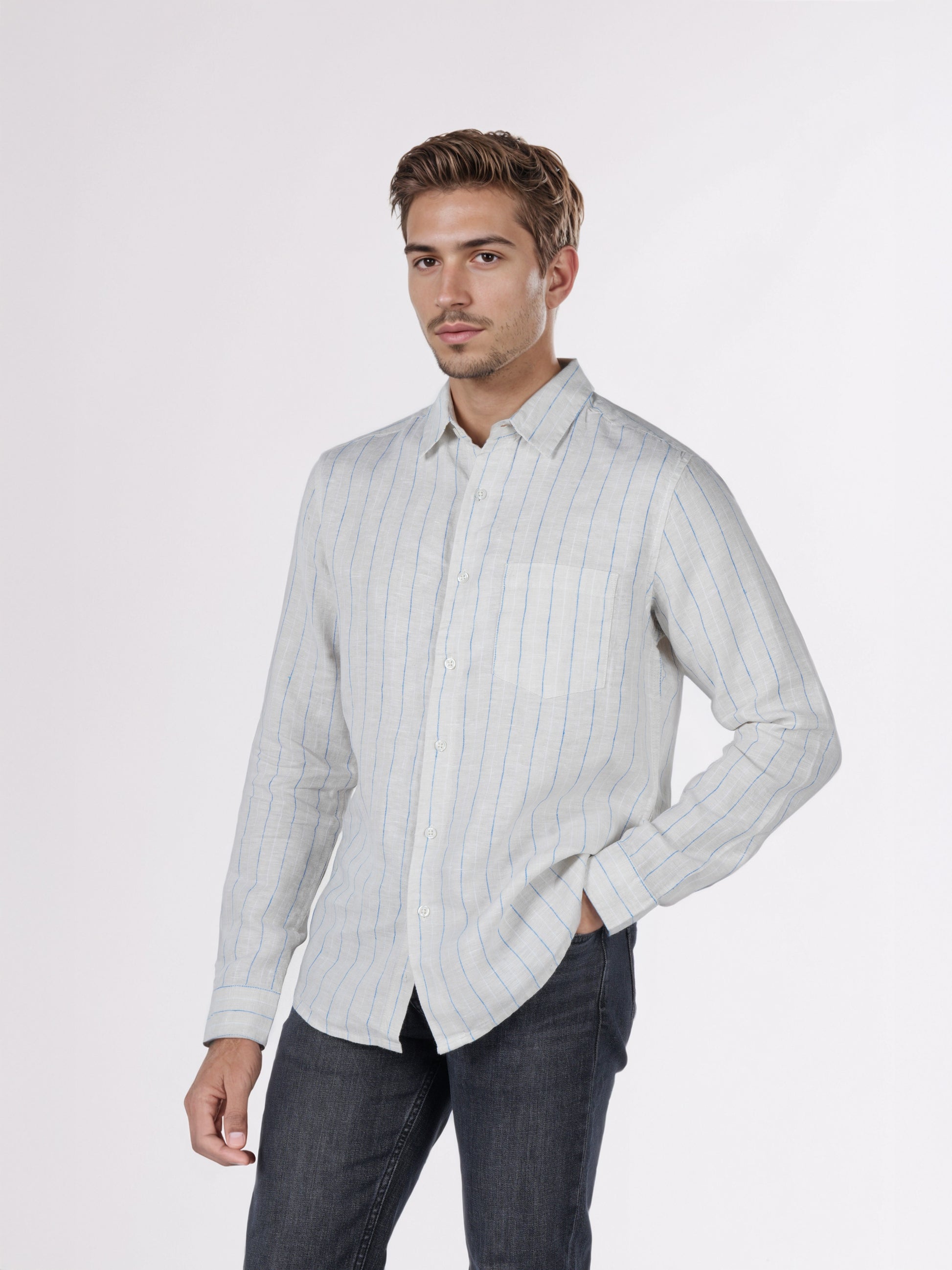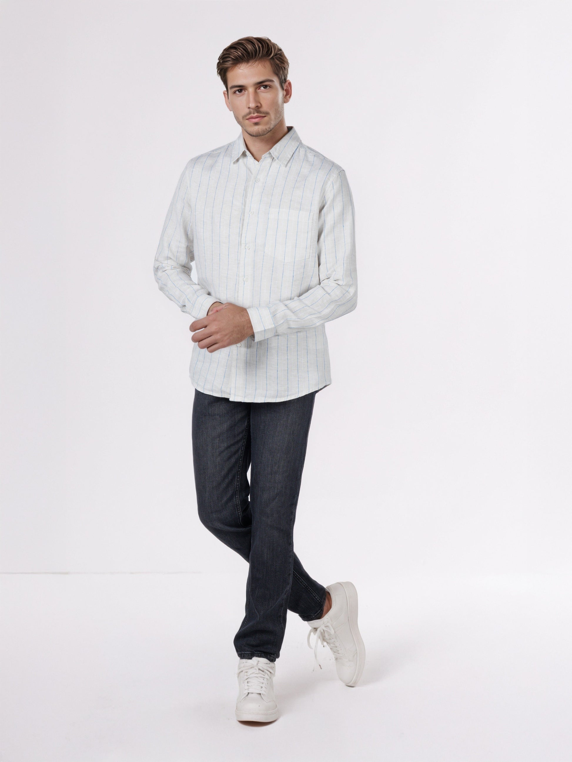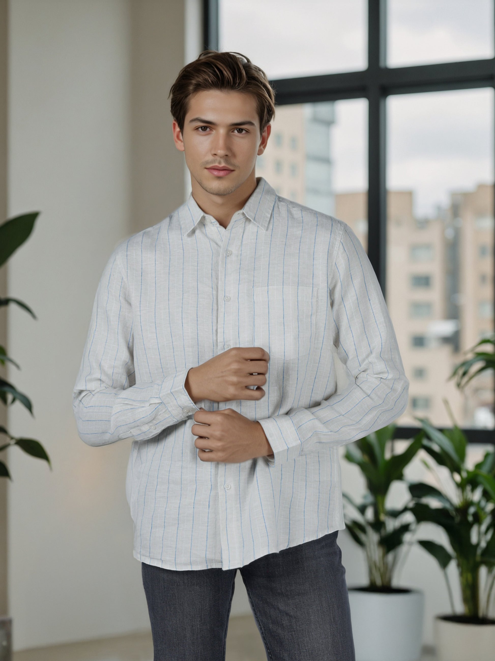 Discover the Celio Men White Striped Regular Fit Linen Shirt, perfect for casual occasions. Crafted from lightweight linen, it features long sleeves and a stylish striped design. Disclaimer: All other items in the image are only for display purposes and will not be a part of the delivery content. Product colour may slightly vary due to photographic lighting sources. Country of Origin - India.