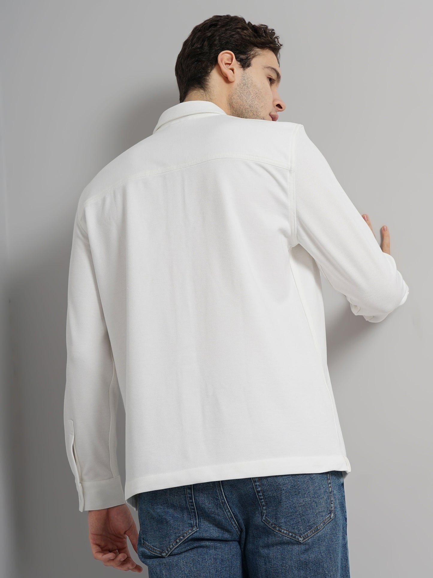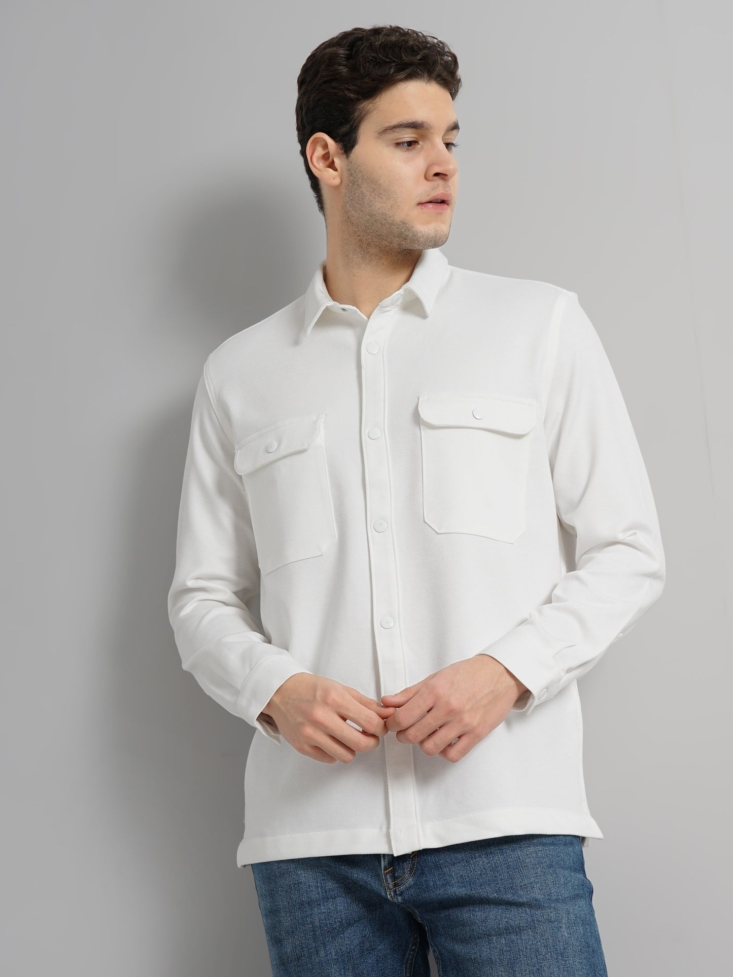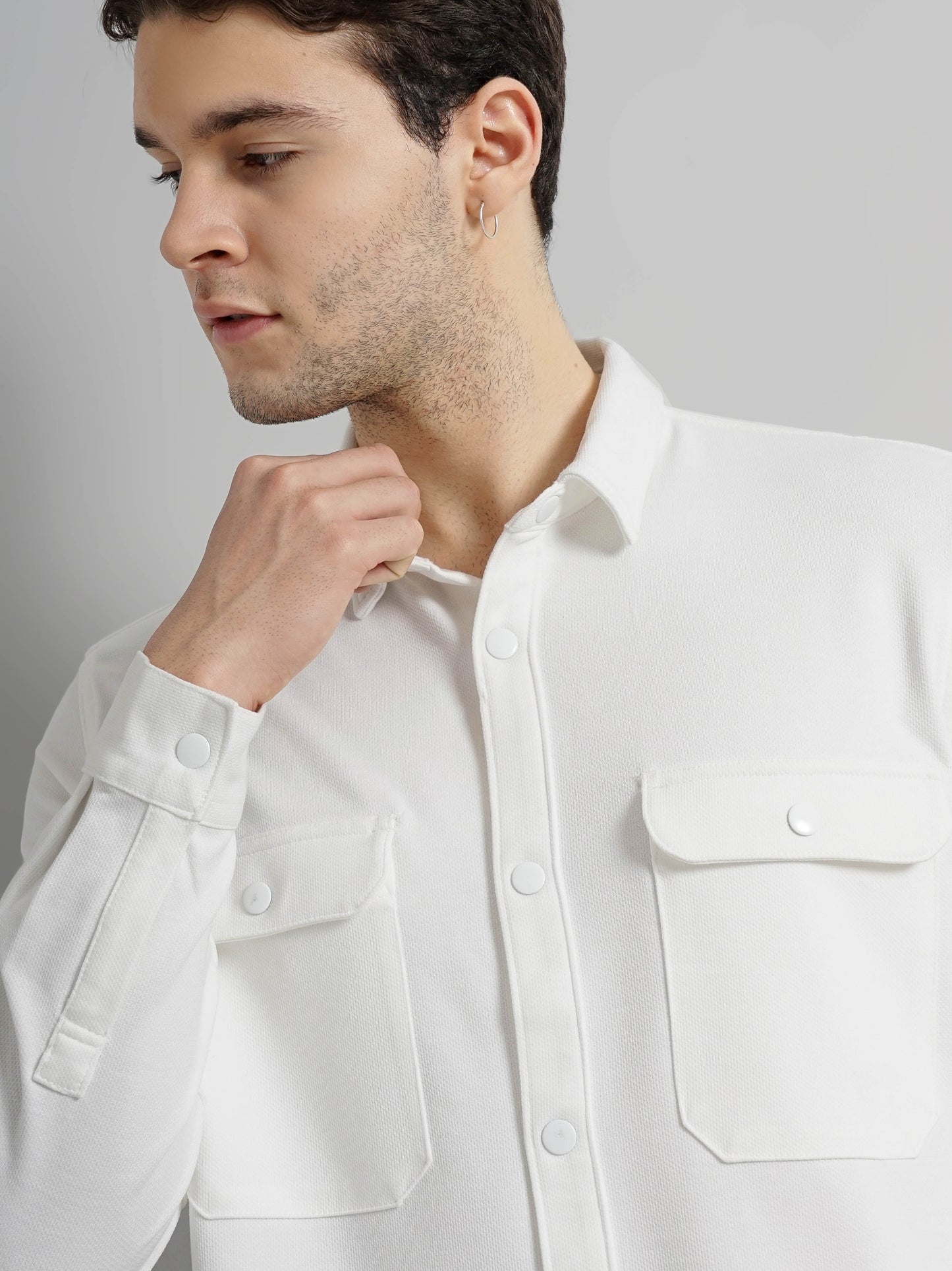 This Celio men's oversized casual overshirt in white is crafted from polyester. It features long sleeves, perfect for a relaxed look on casual occasions. Disclaimer: All other items in the image are only for display purposes and will not be a part of the delivery content. Product colour may slightly vary due to photographic lighting sources. Country of Origin - India.