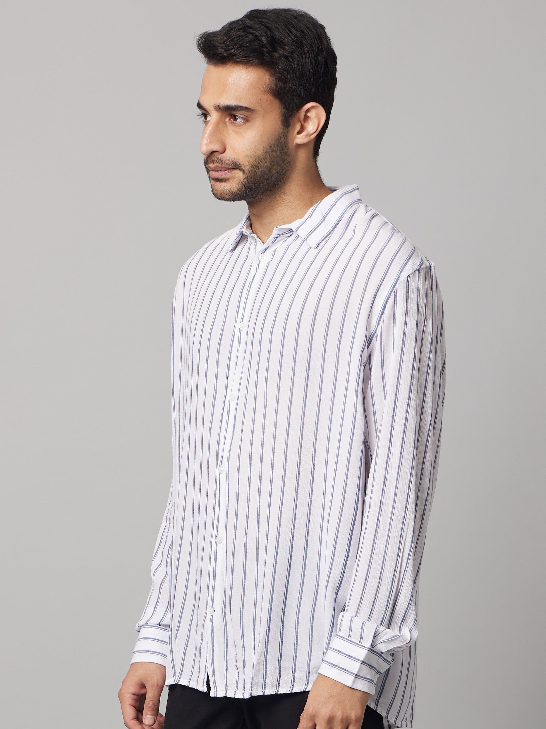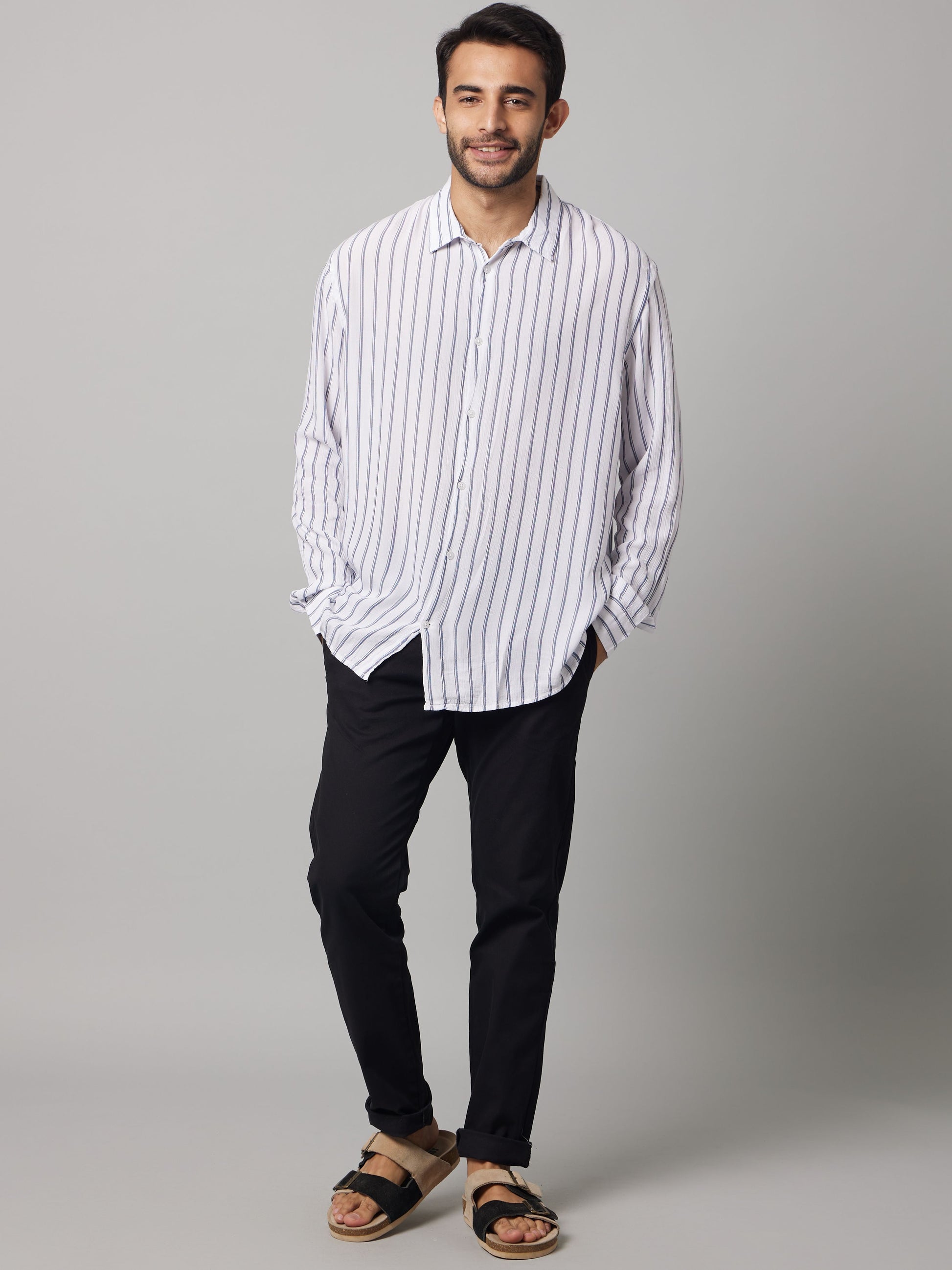 Men's casual shirt by Celio in solid navy blue, crafted from soft viscose. Features long sleeves for a comfortable fit, perfect for relaxed outings. Disclaimer: All other items in the image are only for display purposes and will not be a part of the delivery content. Product colour may slightly vary due to photographic lighting sources. Country of Origin - India