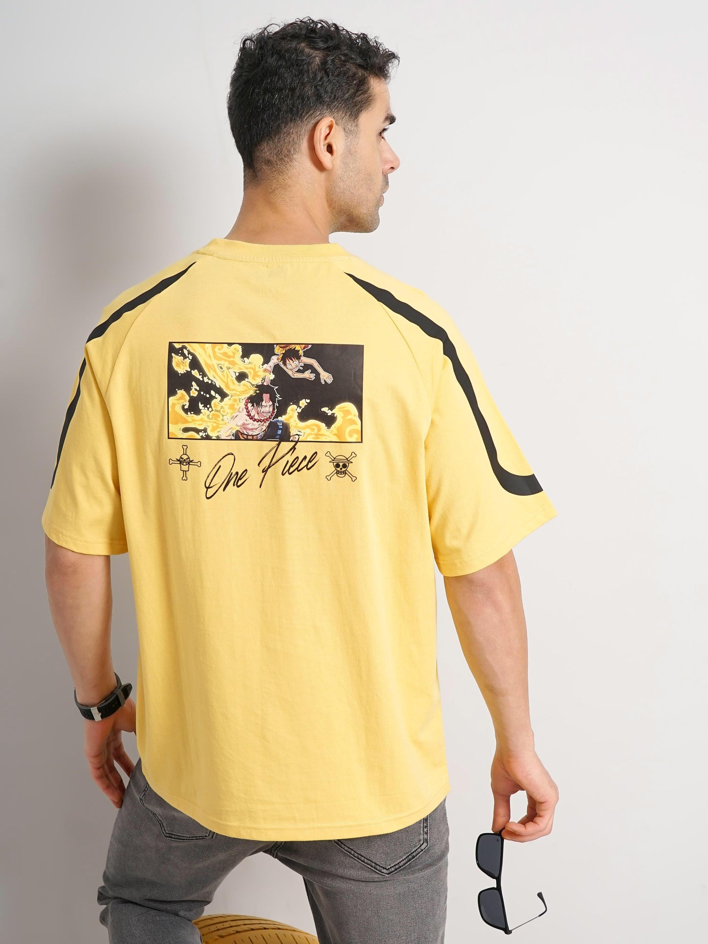 Add a touch of boldness to your wardrobe with the ONE PIECE Yellow Printed Cotton T-shirt. Crafted from soft, breathable cotton, this t-shirt offers the perfect balance of comfort and style for any casual occasion. Featuring a dynamic graphic of Donquixote Doflamingo, complete with his iconic glasses, this t-shirt brings one of the most infamous and charismatic characters of the One Piece universe to life. The bright yellow color adds a fun, eye-catching pop to your outfit, perfect for those who want to stand out. With short sleeves and a regular fit, this t-shirt provides a relaxed yet flattering silhouette, making it perfect for pairing with jeans, shorts, or sneakers. Whether you're showing off your love for One Piece or embracing Doflamingo's unique style, this t-shirt is a must-have for fans of the series. Embark on your own adventure with this bold and stylish tee that showcases the spirit of One Piece. Disclaimer: All other items in the image are only for display purposes and will not be a part of the delivery content. Product colour may slightly vary due to photographic lighting sources. Country of Origin - India.