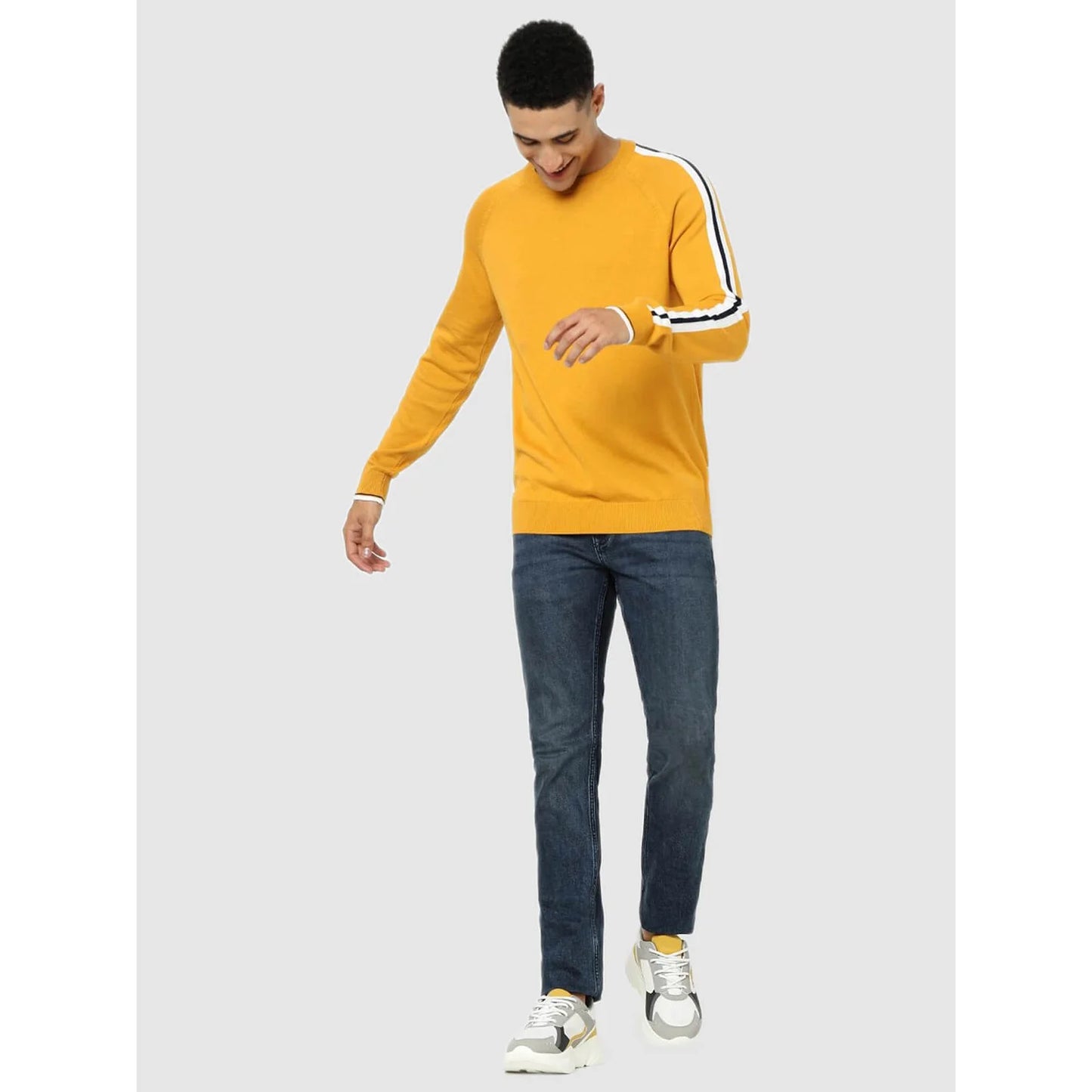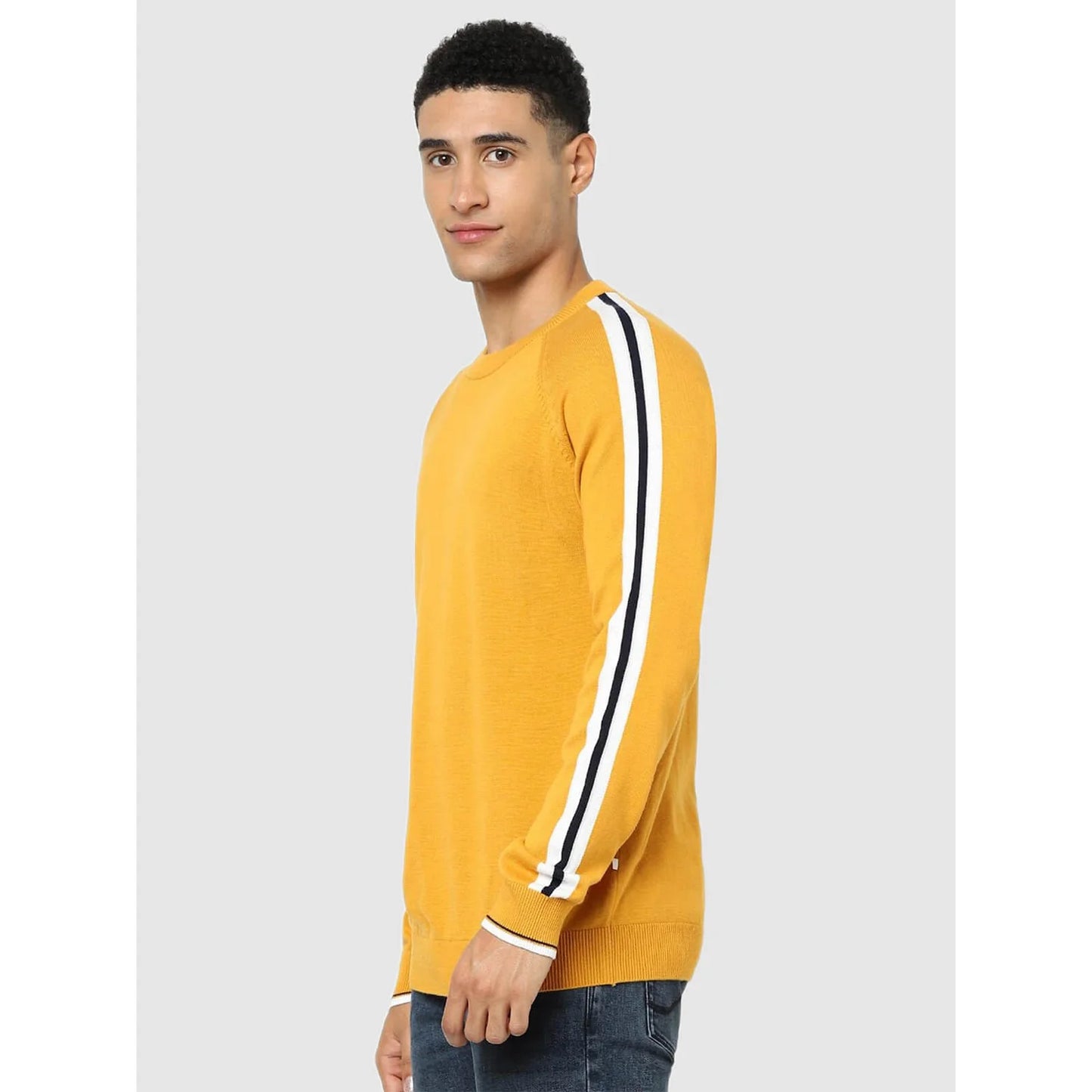 Stay stylish in this Celio yellow solid sweater. Crafted from cotton, it features long sleeves and is perfect for casual occasions. Ideal for men seeking comfort and fashion. Disclaimer: All other items in the image are only for display purposes and will not be a part of the delivery content. Product colour may slightly vary due to photographic lighting sources. Country of Origin - India.